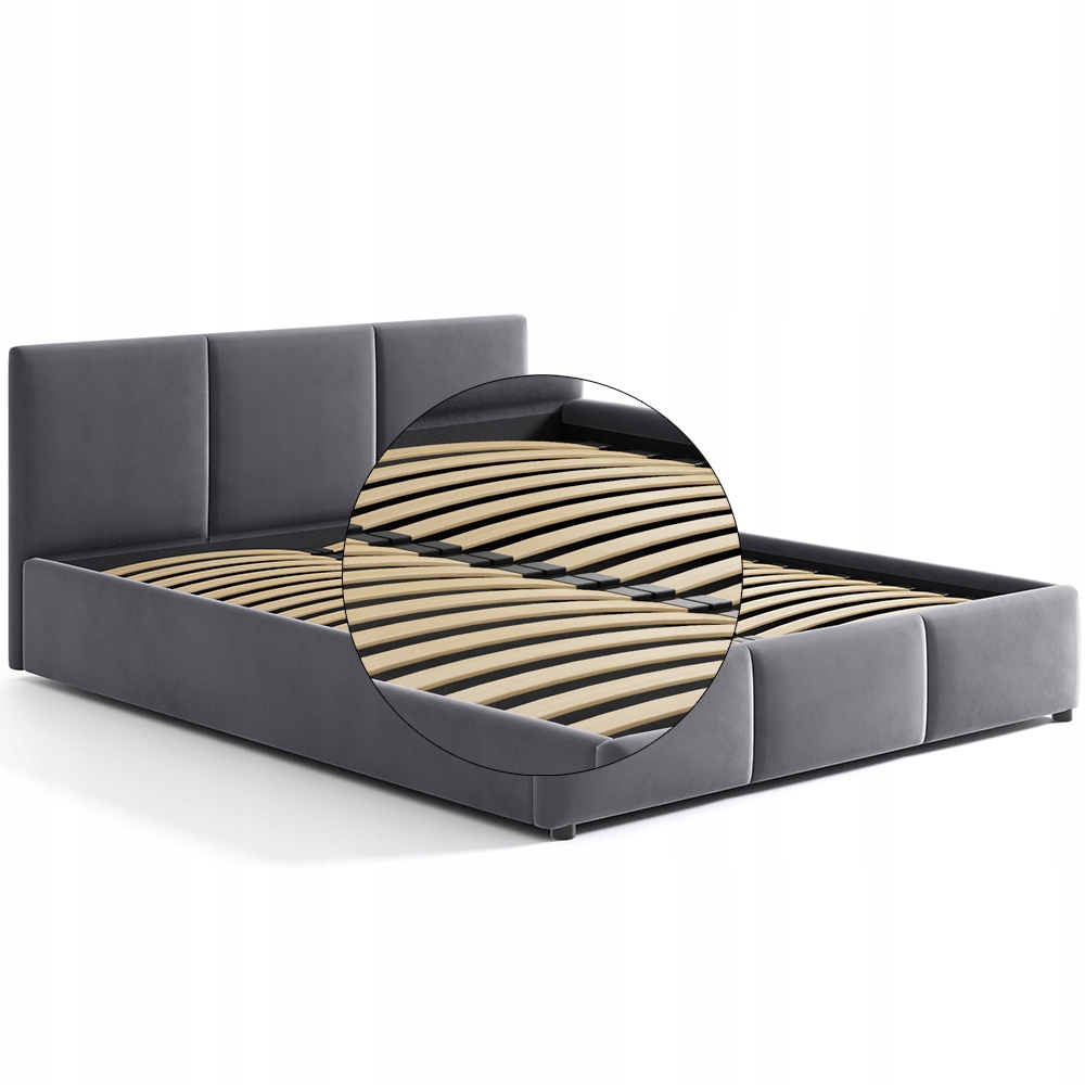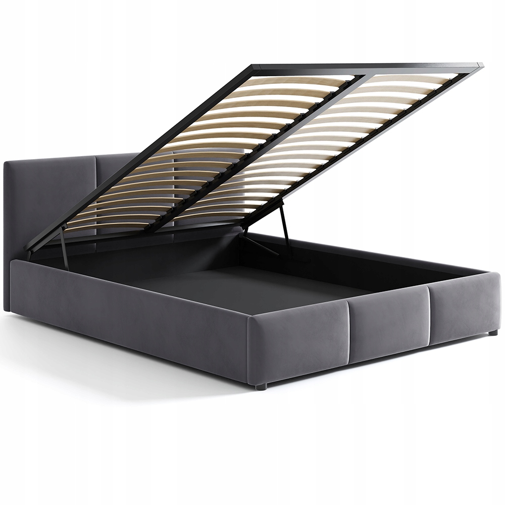 Очень элегантная, современная кровать с мягкой обивкой. Обивка из стильного мягкого бархата графитового цвета. Изготовлен из качественных материалов: основой конструкции является прочный металлический каркас, открываемый газлифтом. Каркас состоит из пружинных реек из древесины тополя.