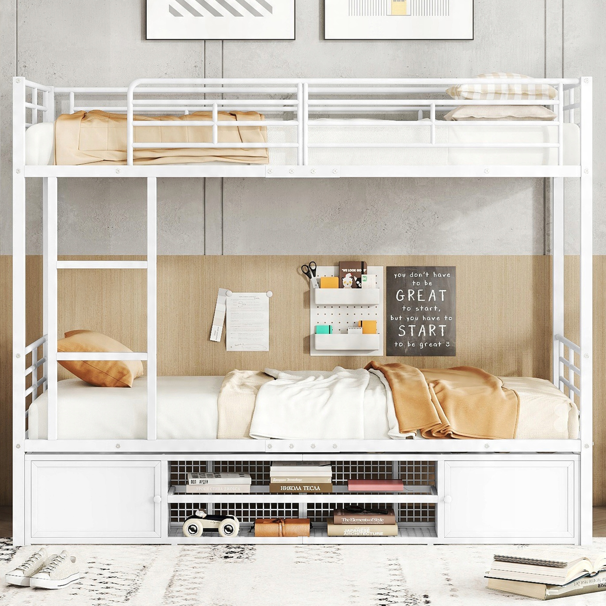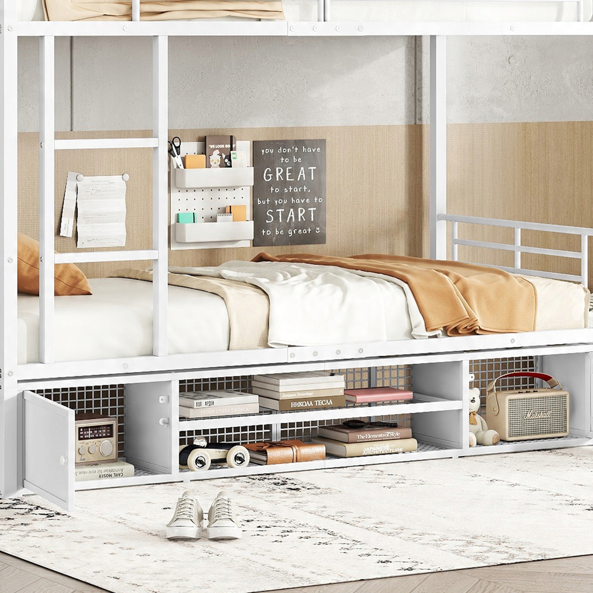 Двухъярусная кровать с отсеком для обуви внизу: Кроме того, у кровати есть дополнительный шкаф для обуви, который обеспечивает дополнительное место для хранения вещей. обувь и другие мелкие вещи. Это экономит пространство и поддерживает порядок в комнате.