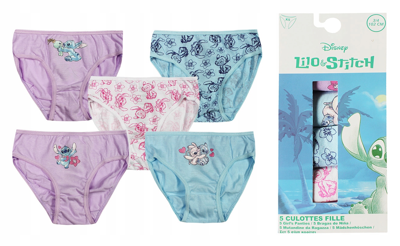 трусики для девочек из коллекции Lilo и Stitch - это уникальный набор, который содержит 5 пары трусиков, упакованных в красочную коробку. украшен уникальным рисунком, связанным с персонажами и мотивами из серии "Lilo и Stitch".