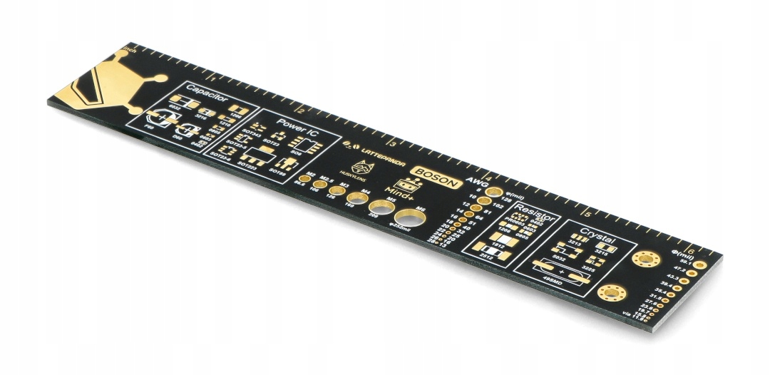 Линейка, используемая при проектировании печатных плат. В дополнение к стандартной шкале, позволяющей измерять расстояния, он включает, среди прочего, шаблоны для поперечных сечений проводов AWG и наиболее популярных размеров винтовой резьбы. На нем также представлены изображения популярных корпусов интегральных схем и электронных компонентов с подписями. Изделие изготовлено из прочного пластика. Инженерная линейка градуирована в сантиметрах и дюймах. Его длина: 16 см / 6,3''.