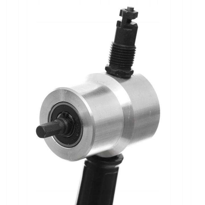 Насадка для сверла используется при резке листового металла. Очень простой дизайн и удобство использования. Приспособление работает по принципу разрывателя листового металла: специальное лезвие, приводимое в движение сверлом, совершает возвратно-поступательное движение, разрывая листовой металл. Корпус насадки изготовлен из алюминия, механизм – из закаленной стали. Шестигранный приводной штифт.