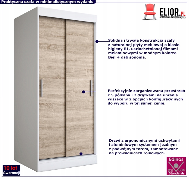 Corina 2x Slind Wardreobe - это предложение бренда Elior, предназначенное для людей, которые ищут прочный, практичный и стильный гардероб с функционально запланированным интерьером . Corina 2x имеет рационально запланированное место для хранения с 5 емковыми полками для одежды, нижнего белья и хабердашерии. Для удобства наших клиентов можно заменить верхнюю полку дополнительной палкой. Замена внутренней системы не требует запуска гардероба, что чрезвычайно практично. Гардероб Corina 2x отличается вневременным дизайном и модными, привлекательными фронтами на выбор. Большим преимуществом мебели является эстетическая отделка фронтов и тела, без видимых винтов и винтов, подчеркивая его современный дизайн. Это гардероб Elior Corina 2x, сделанный в любом выбранном интерьере, и многие аранжировки, от классических и скандинавских, минималистских, до модной атмосферы Country Loft.