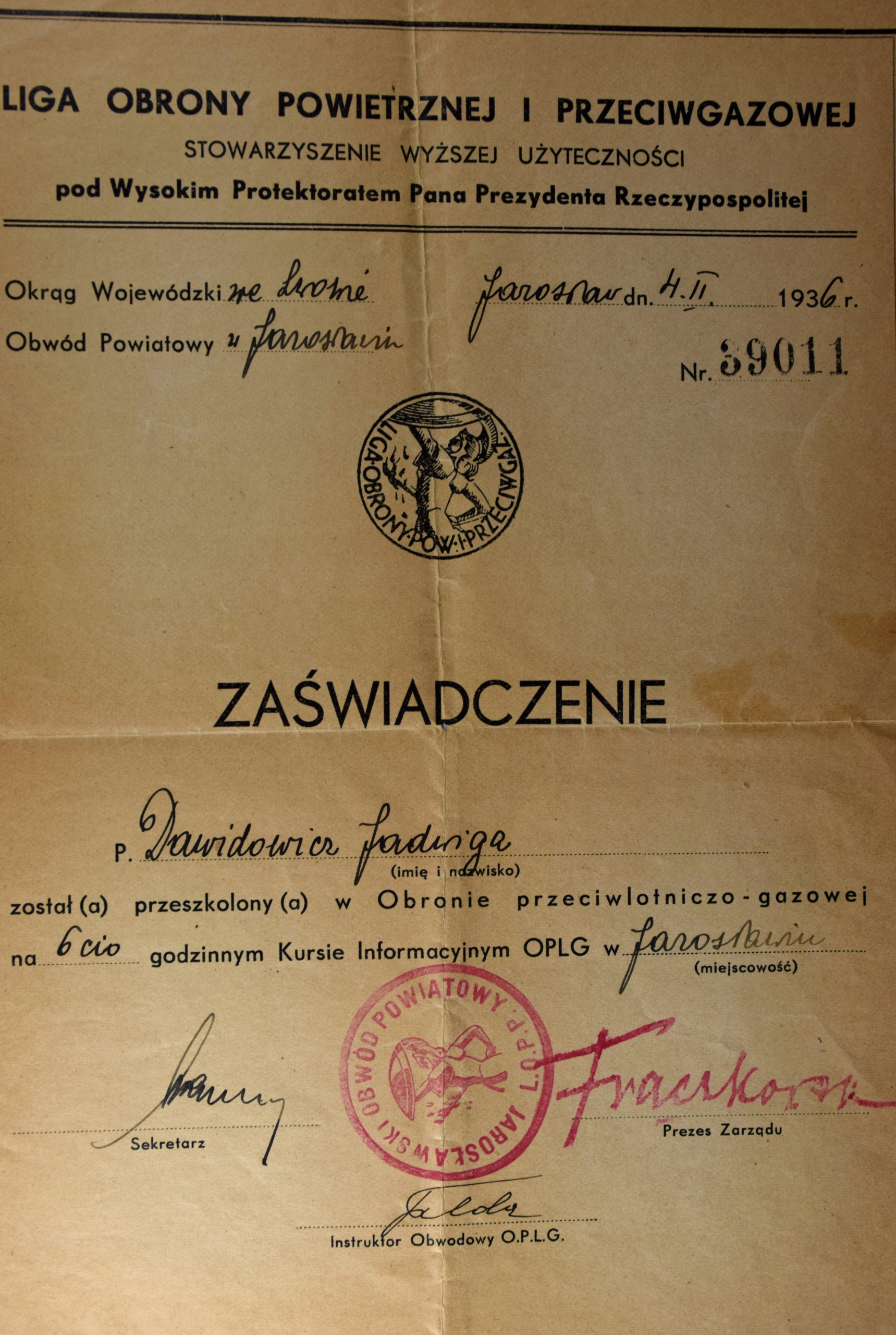 LOPP - Сертификат OPLG Course Jarosław 1936 Лига противовоздушной обороны