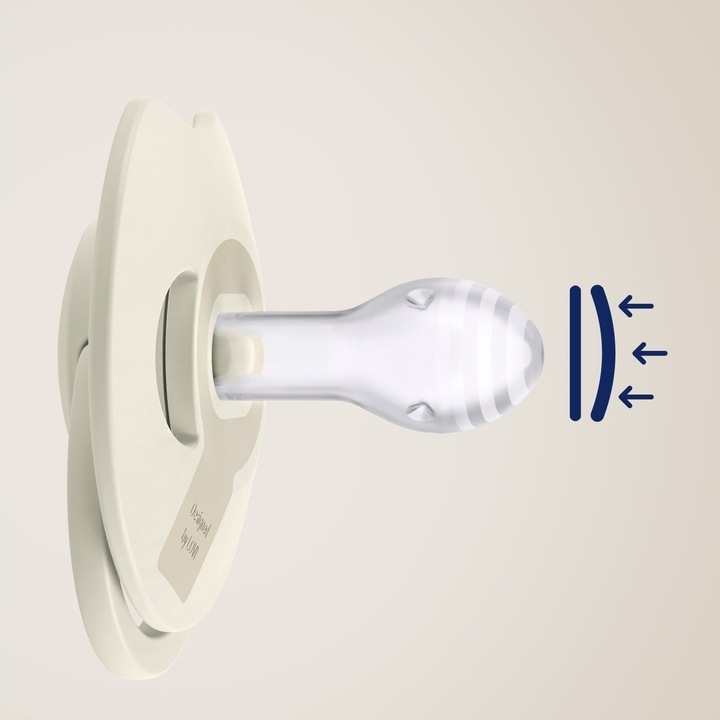 Динамический успокаивающий соска различной толщины, растягивается и сжимается в соответствии с ритмом сосания ребенка. Благодаря этому он защищает свой всасывающий рефлекс и не оказывает неблагоприятного влияния на грудное вскармливание. Форма ластика симметрична и вдохновлена формой соска, чтобы обеспечить знакомые чувства для ребенка. Диск по снижению сочинения имеет специальную часть, чтобы облегчить дыхание в носу и глотать слюну, как с грудью. Профилированный щит прилипает к коже ребенка как можно меньше, что облегчает поток свободного воздуха и снижает риск раздражения кожи.