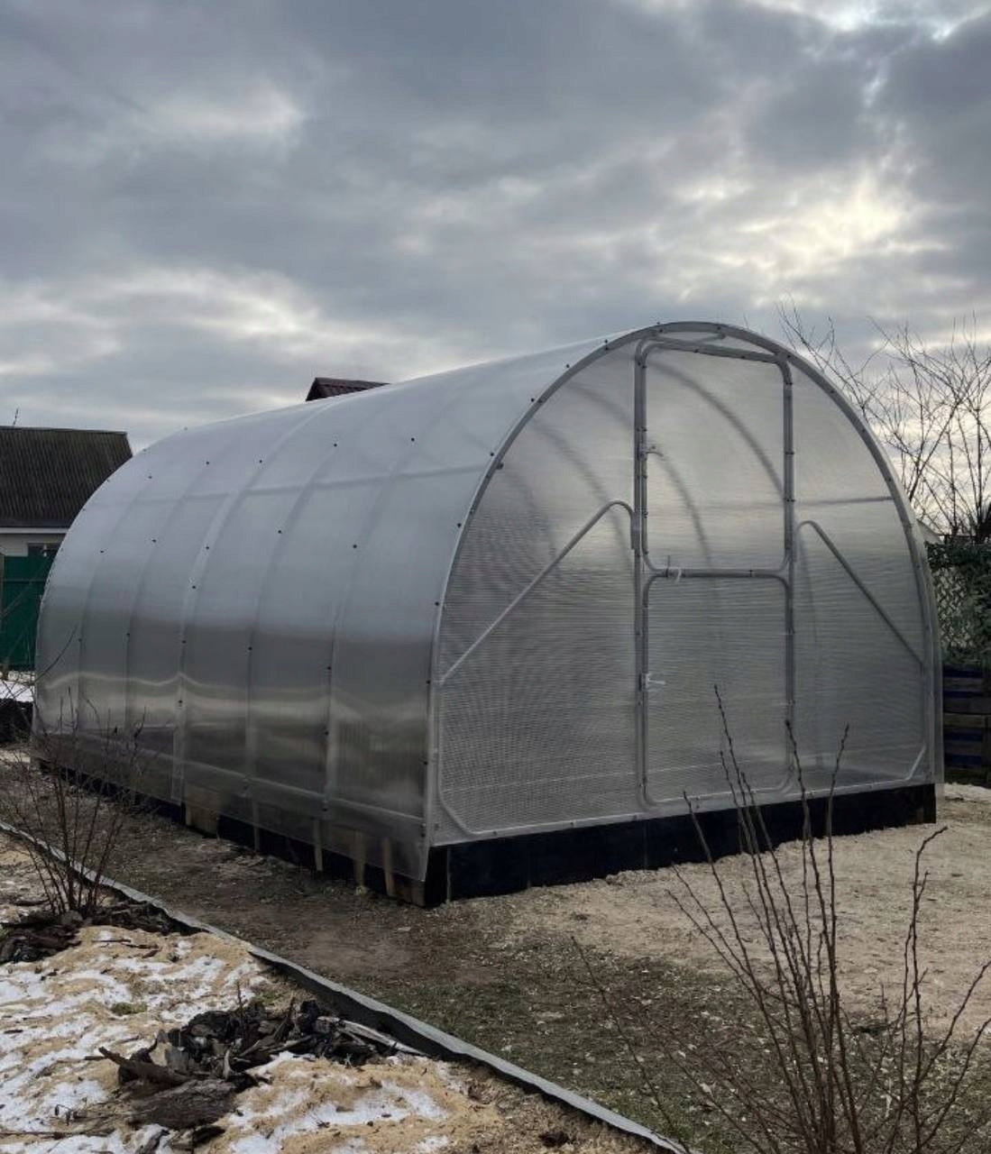 - покрытие - 6 мм поликарбонат устойчив к ультрафиолетовому излучению и стандартным погодным условиям (маленький град). У него срок службы до 10 лет. Имея прочный и сильный скелет, теплица способна выдерживать снежный нагрузку до 140 кг/м2 (что соответствует 50-55 см свежего снега), что означает, что поликарбонат легко выдержит даже снежную зиму. Круглая форма теплицы предотвращает снег.