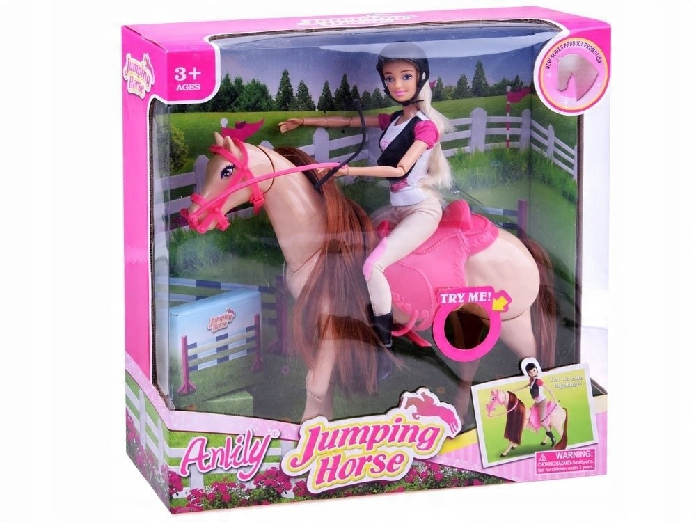 У нее длинные распущенные волосы, поэтому ребенок тоже может носить различные прически, а также имеет так называемый шлем. токе для верховой езды. И лошадь, и кукла имеют сгибаемые конечности.