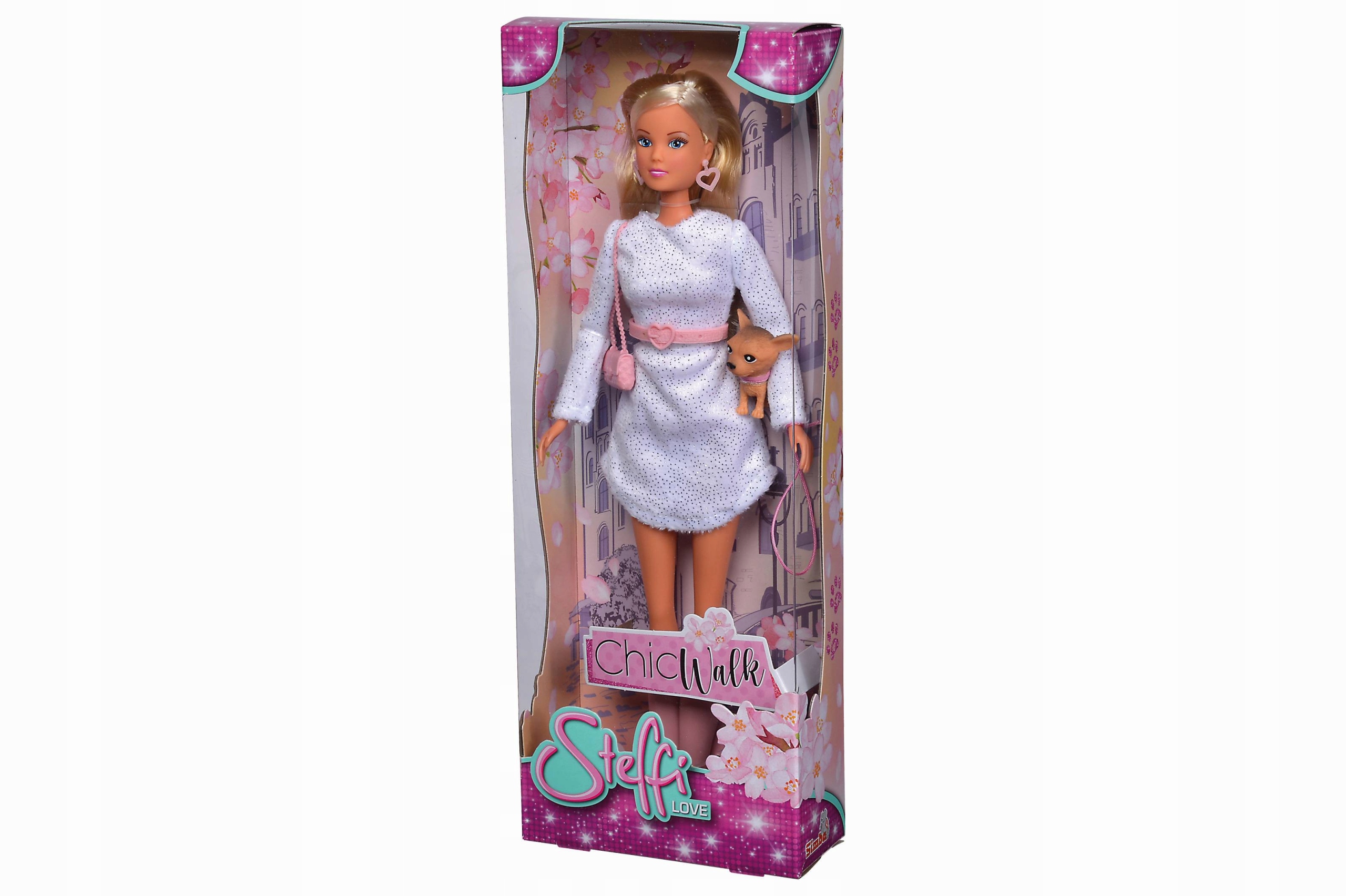 Стеффи -кукла в ослепительной стилизации всегда согласуется с текущими тенденциями и соответствует обстоятельствам, в которых она находится. На этот раз Штеффи для оригинального платья с длинными рукавами и блестящими частицами сопоставила аксессуары, такие как ремень с пряжкой в форме сердца и серьги в форме сердца, что подчеркивает оригинальность стилизации. Кроме того, сумочка и ботинки добавляют анимис из стиля. Кукла сопровождается очаровательной собакой чихуахуа, которую он ведет на поводке.