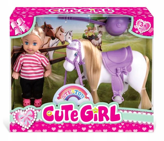 кукла с лошадью и шлемом. У куклы длинные светлые волосы, в то время как у лошади длинная грива и хвост. Продукт предназначен для детей с 3 лет. Игрушка упакована в картонную упаковку с прозрачным окном. Приведенные размеры являются размерами упаковки.