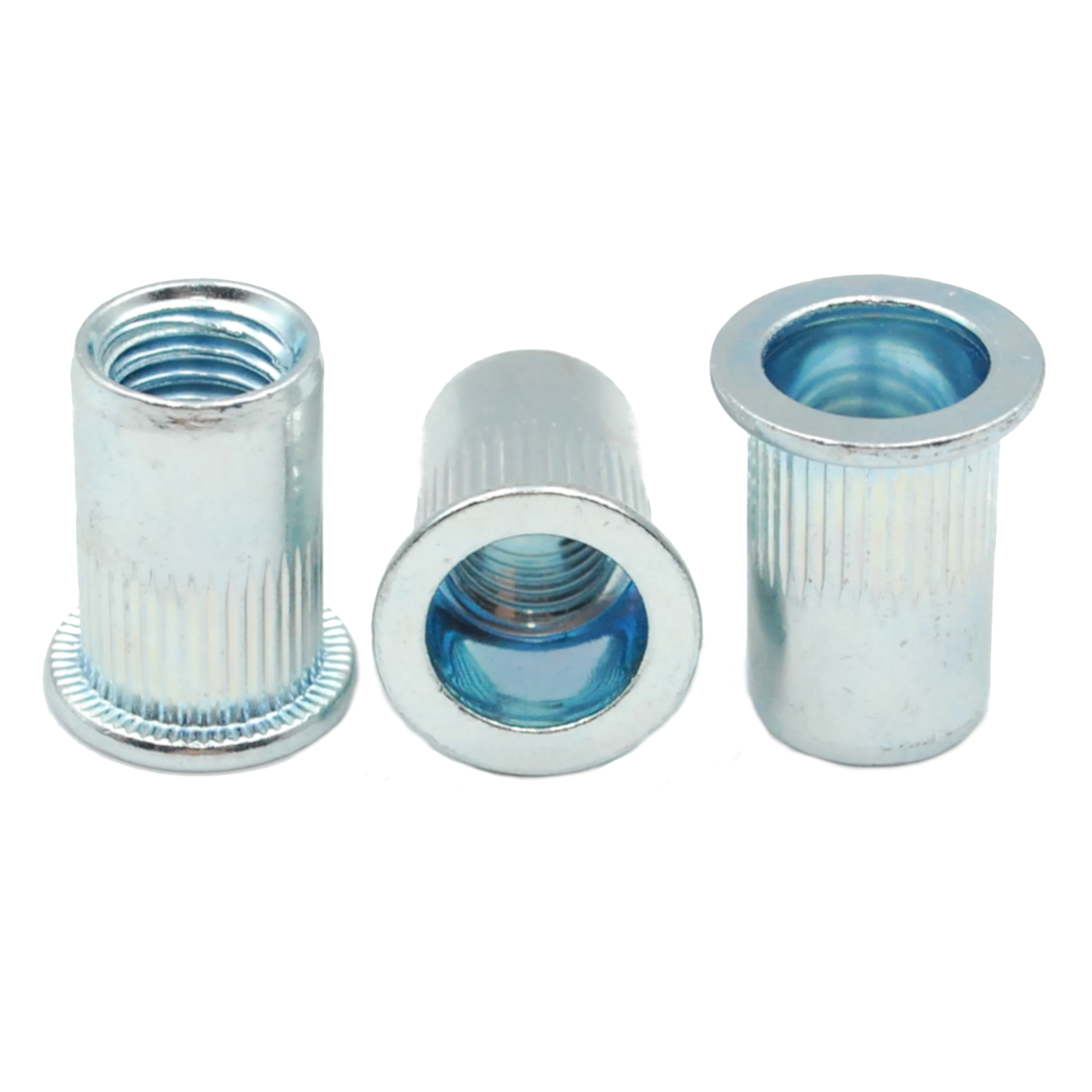 Заклепка-гайка, цилиндрический буртик, с накаткой, гильза из оцинкованной стали.