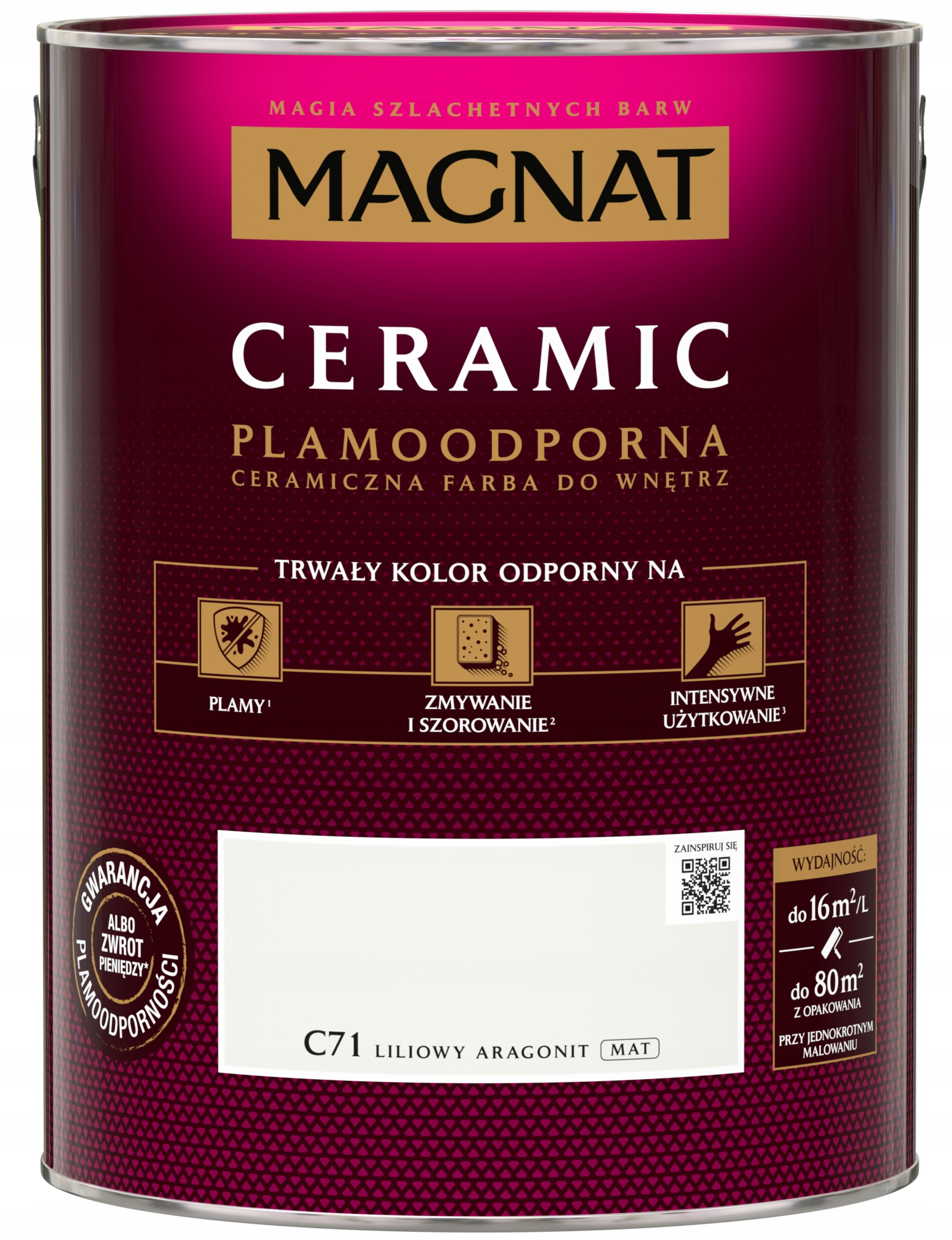 Magnat Ceramic-это краска, предназначенная для декоративной и защитной живописи стен и потолков внутри комнат из цементных растворов, цементного лайма, гипса, кирпичей, гипсо-карты, деревянных, деревянных, деревянных и обоев, а также стекловолокна. Из -за уникальных свойств и долговечности краска рекомендуется для рисовых комнат, особенно уязвимых для грязи и поверхностей, которые требуют дезинфекции, например, Маршруты связи, коридоры, частные комнаты, офисные комнаты и медицинские услуги, салоны и съедобные приложения.