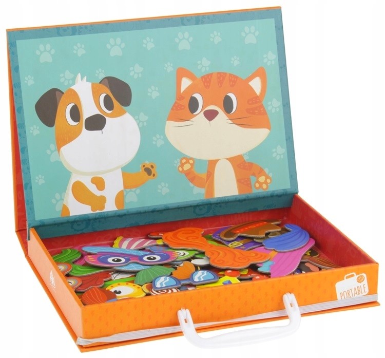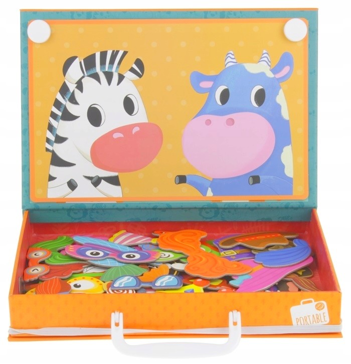 Магнитная доска с красочными элементами головоломки - отличный набор для обучения и интересного веселья! Чертежи могут быть созданы двумя способами: либо расположены их из магнитных элементов, либо рисовать непосредственно на доске благодаря маркеру, прикрепленному к набору. Каждый рисунок может быть легко стерт, и весь набор с удобным чемоданом может быть взят с собой везде.