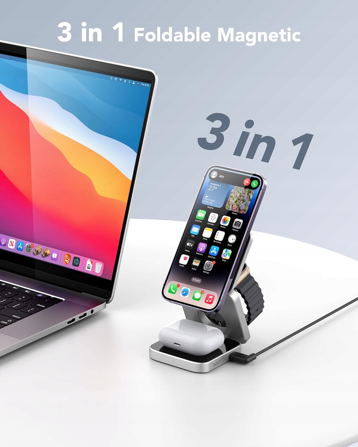 Магнітна бездротова зарядка, док-станція 3в1 для Apple AGPTEK