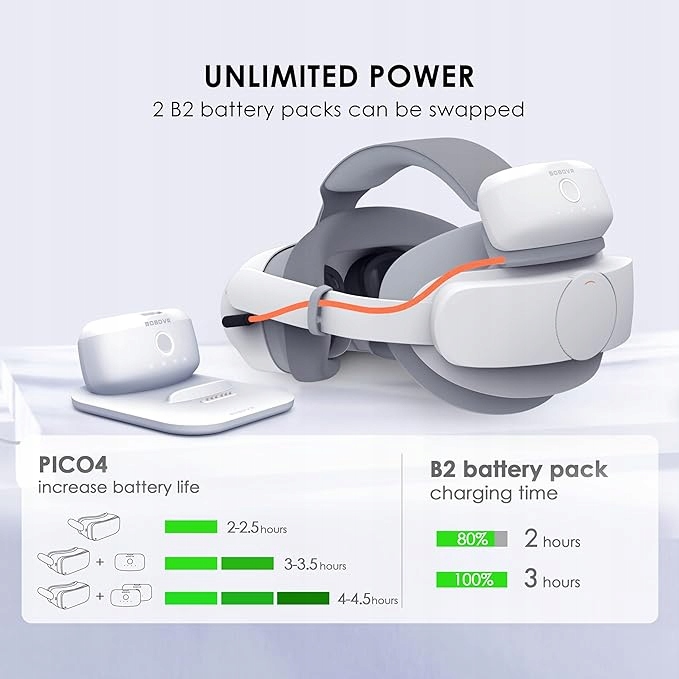 Bobovr Специально разработал набор улучшения пояса PICO4, который может улучшить время автономной работы и комфорт PICO4. Он содержит круглую систему питания, состоящая из 2 магнитных всасывающих батареи и зарядной подставки, а также улучшает заднюю часть подушки под головой и верхним ремнем