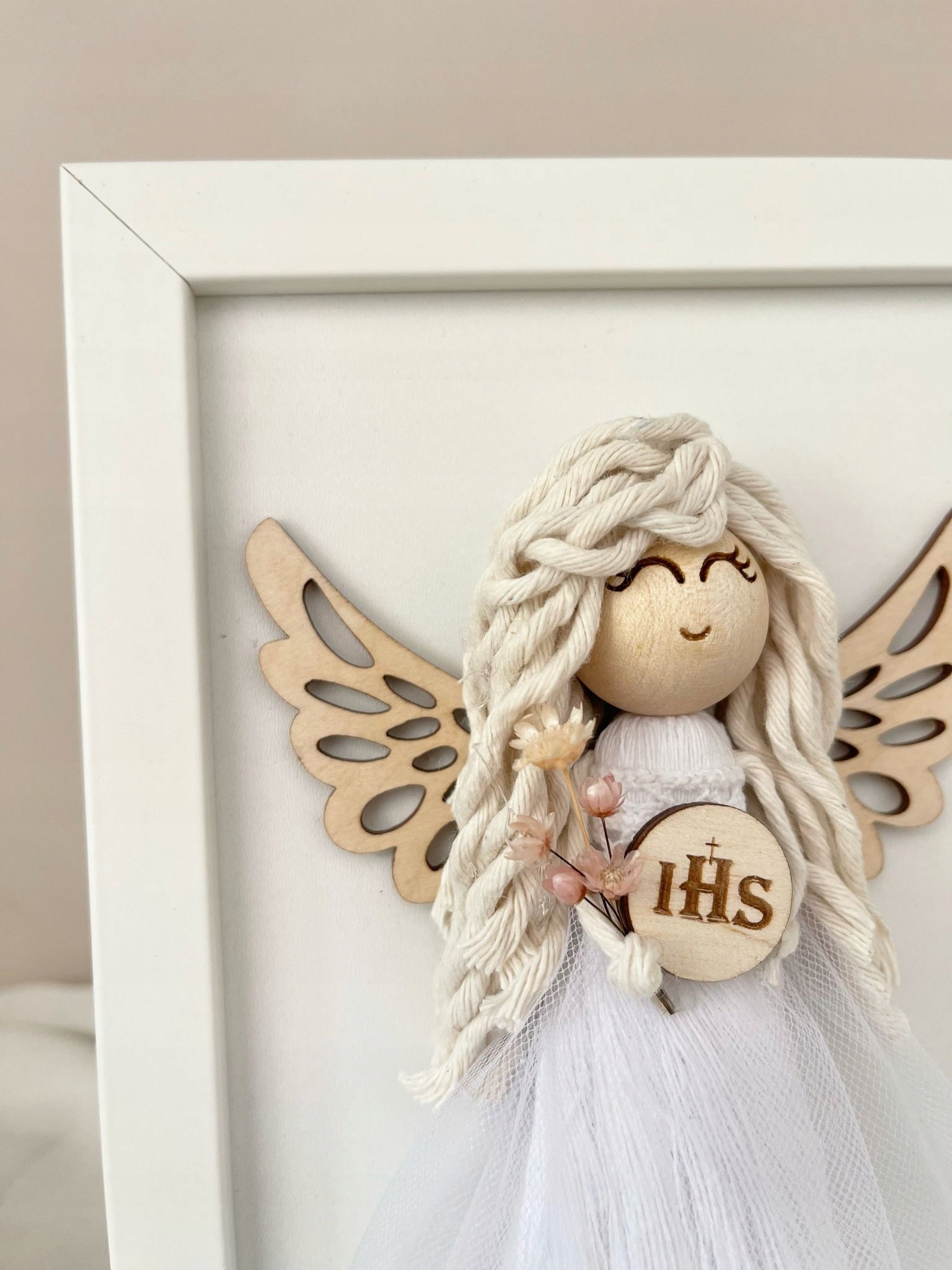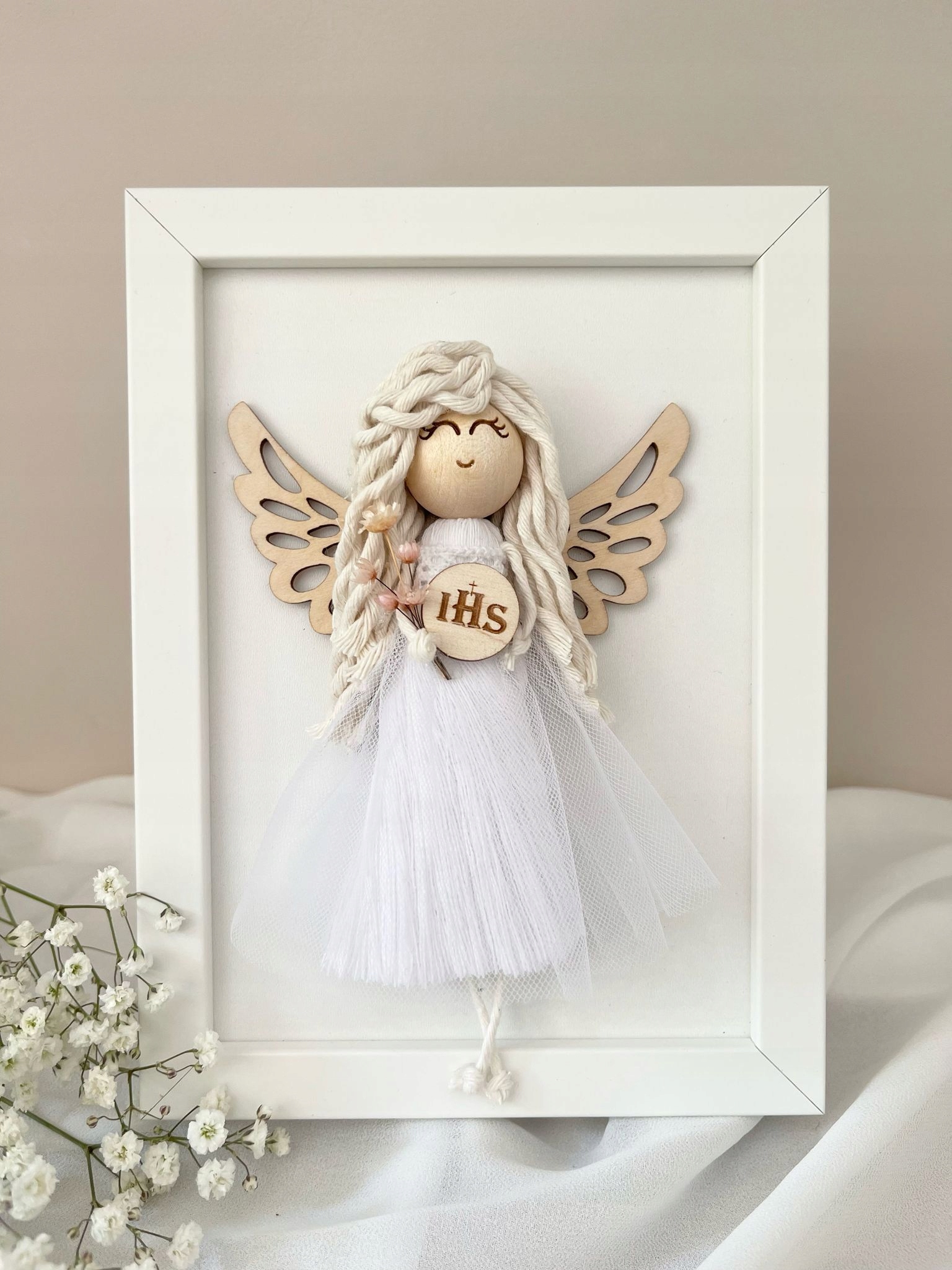 Ангел макрама в кадре для первого причастия и крещения сувенирная девушка