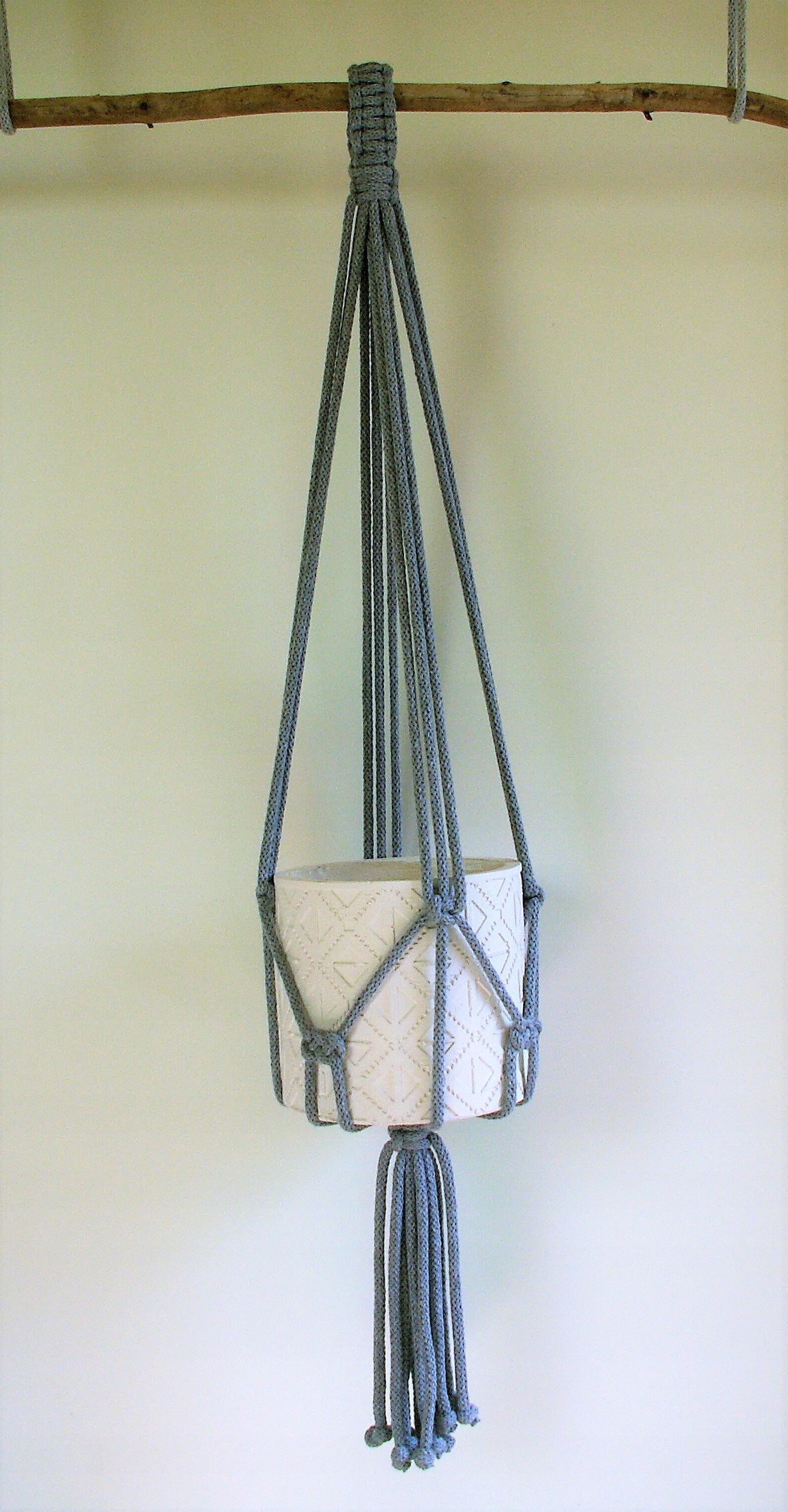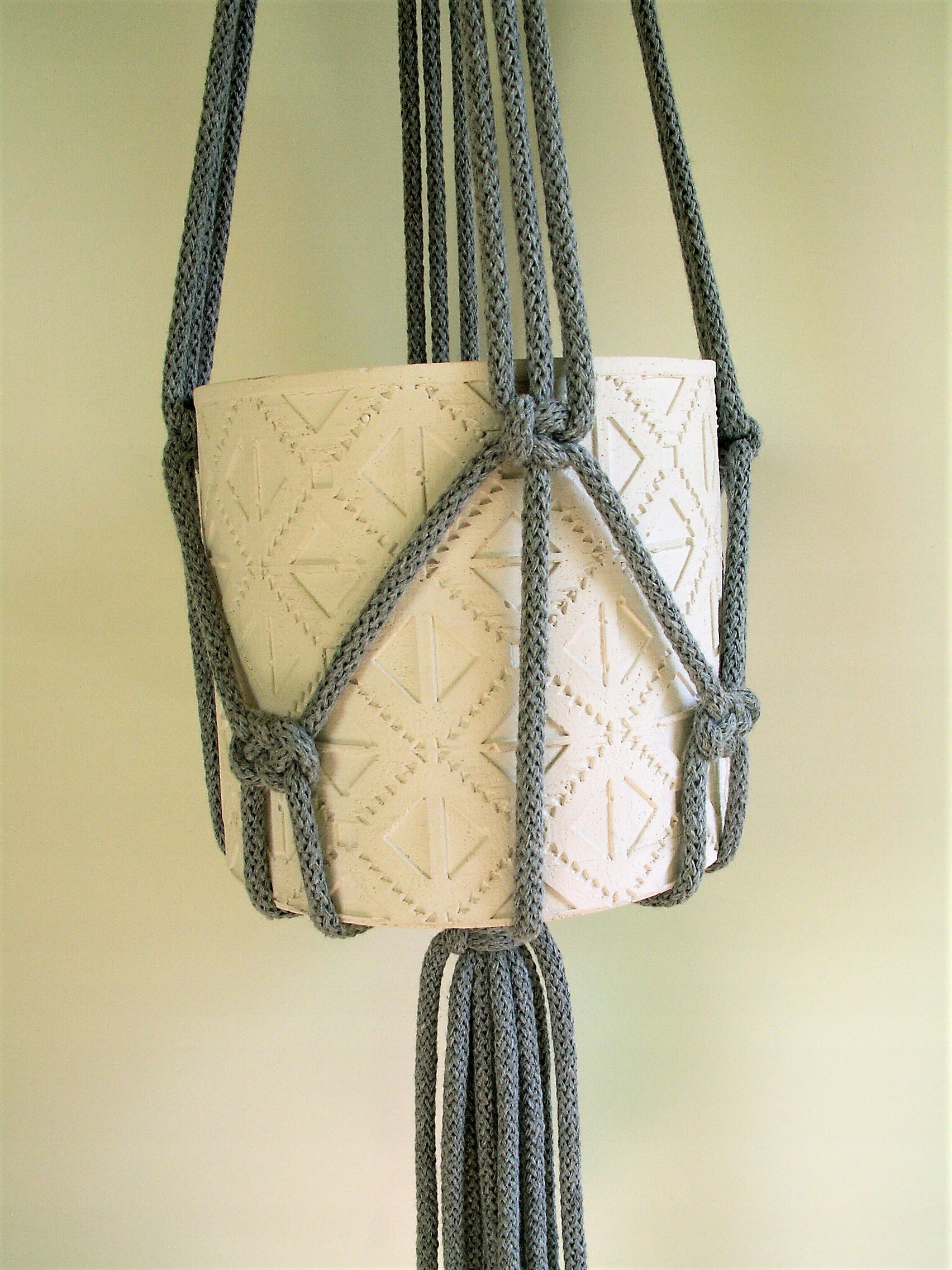 Подставка для цветов сплетена в технике макраме из качественной хлопковой нити с наполнителем из полиэстера. Прекрасно подходит для горшков диаметром 10-20 см. Цвет серый.