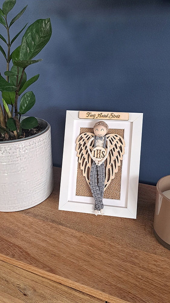 Макраме в рамке для мальчика Ангел-Хранитель на память о Первом Святом Причащении
