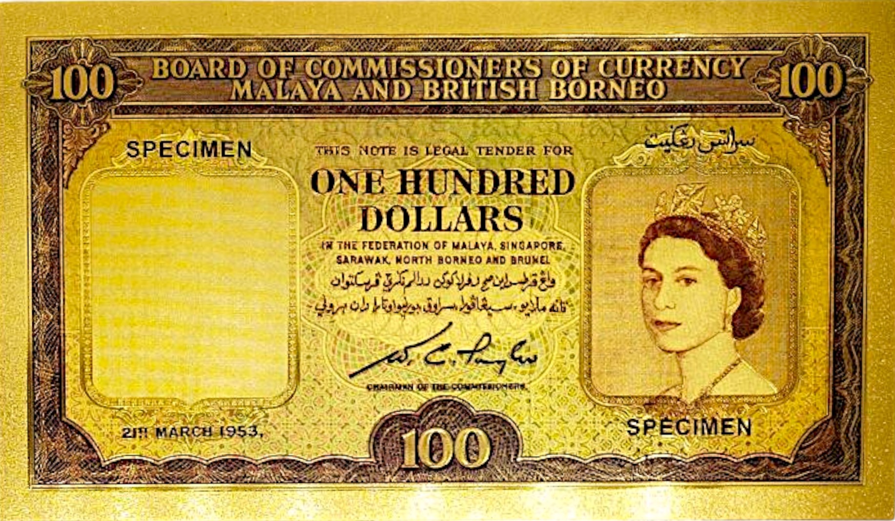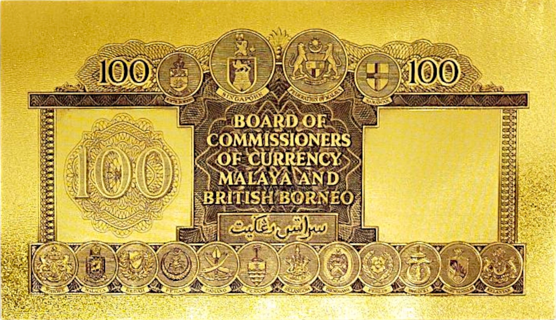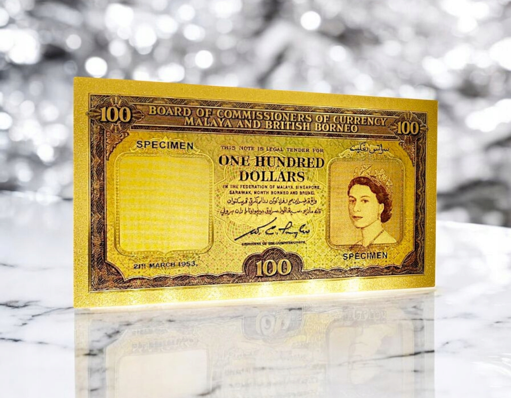 уникальная банкнота коллекционера-это причудливая копия исторической банкноты на 100 долларов с 1953 года, выпущенного Советом валютных комиссаров Малайского и британского Борнео. Эта необычная копия сделана из высококачественного ПВХ -пластика и покрыта блестящей золотой пленкой, что делает ее уникальным дополнением к каждой коллекции колониальных банкнот или сувениров. H2>
