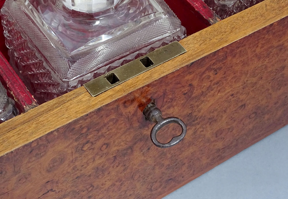 Вся эта вещь помещена в оригинальную коробку, внутри обложенную красным материалом, а снизу - подушечку. крышка с позолоченными, рельефными узорами. задача которого – стабилизировать графины. Все хрустальные емкости с пробками, один графин с носиком чуть меньшего размера. Шкатулка с двумя латунными выдвижными ручками по бокам и функциональным замком с ключом.