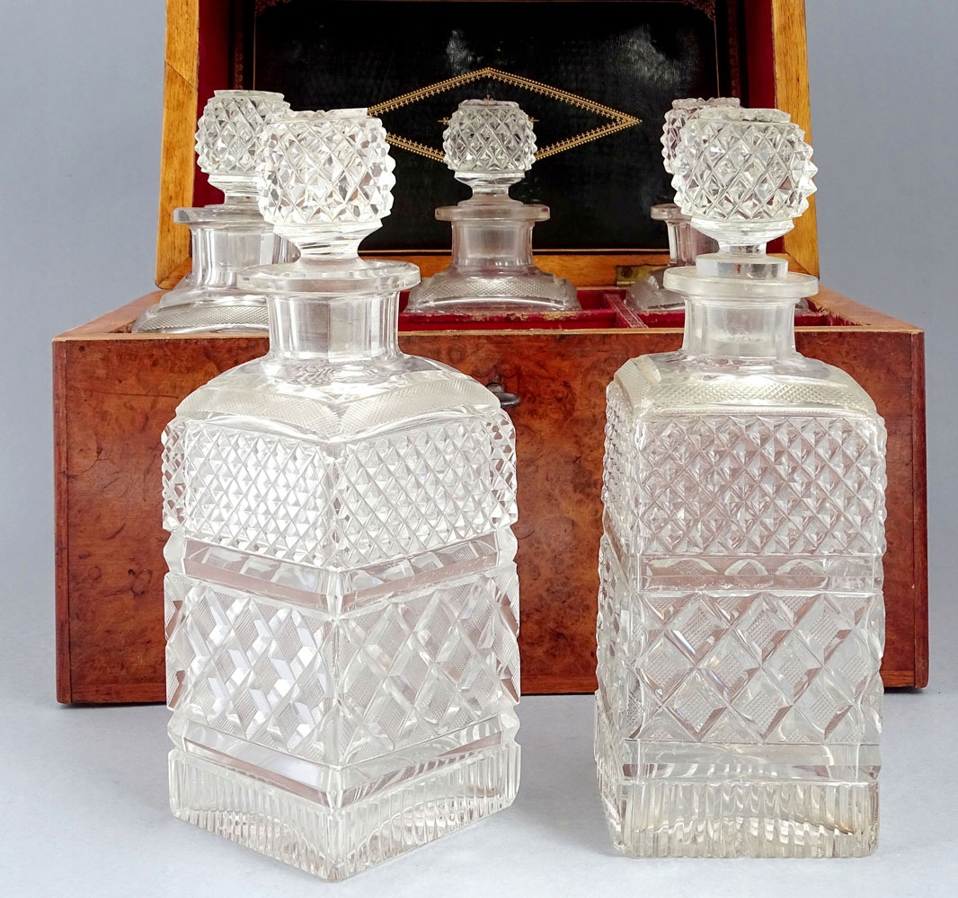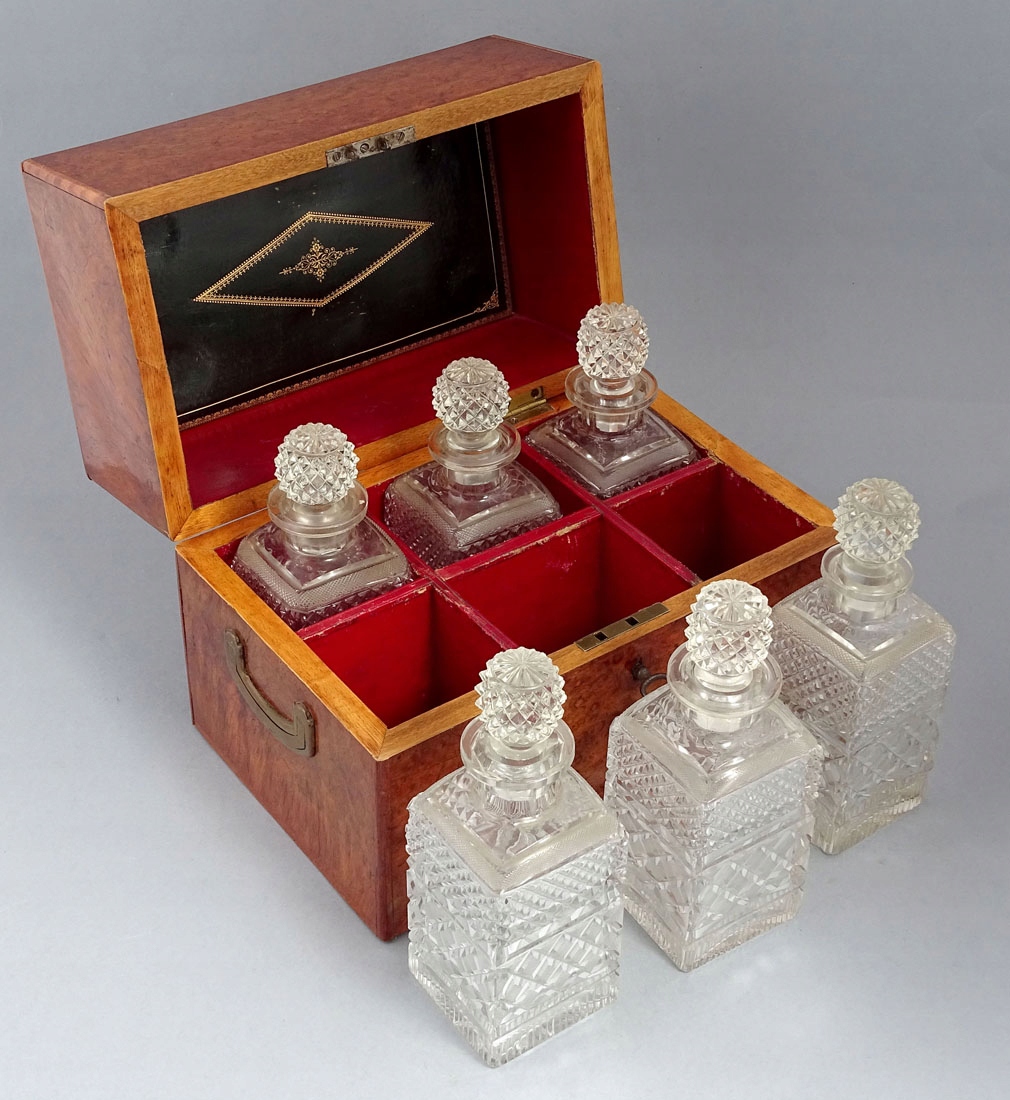 Корпус дуба, шпон ореха, ручки латунные, набор из шести хрустальных графинов, около 1900 года.
