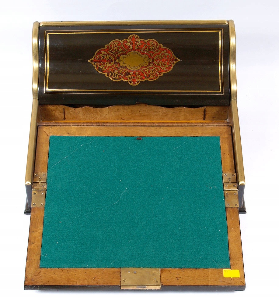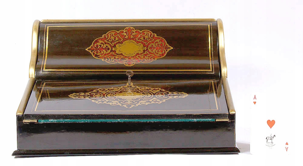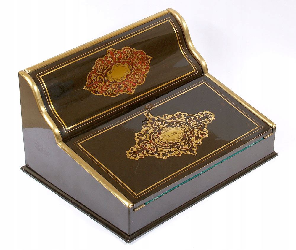 Оба подвижных элемента инкрустированы маркетри из латунного листа и черепахового панциря. Внизу буквы выгравированы по центру. Накладной замок.