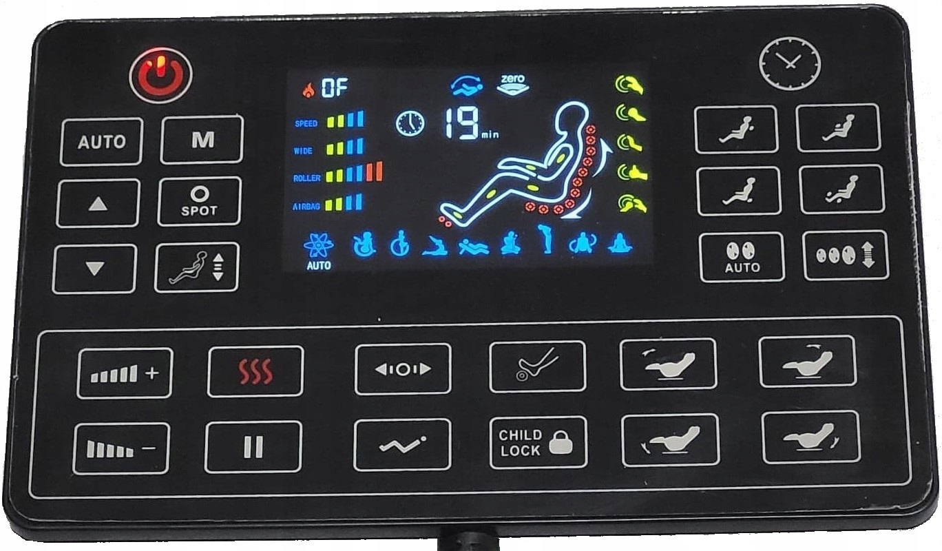 Положение НУЛЕВОЙ ГРАВИТАЦИИ. Под невесомостью подразумевается положение лежа, в котором тело пользователя расположено таким образом, что кажется, что оно плывет или подвешивается. Эта позиция призвана уменьшить давление на позвоночник и равномерно распределить вес тела. Это часто достигается путем наклона кресла под определенным углом, обычно около 130-140 градусов от вертикального положения. Наше кресло откидывается в это положение одним нажатием кнопки, и это положение рекомендуется вызывать перед каждой программой массажа.