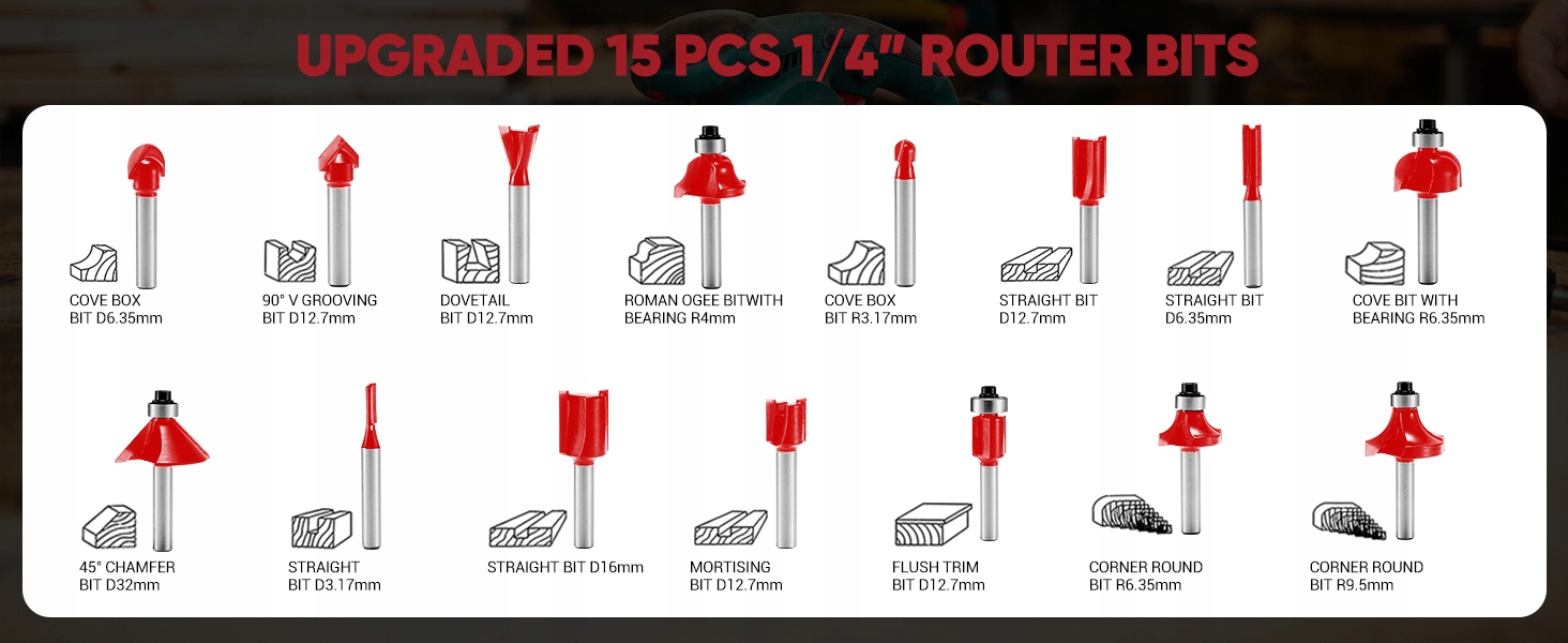 • Резаки 1/4 "-15 типов (включая пальцы, V-образный, округлый)