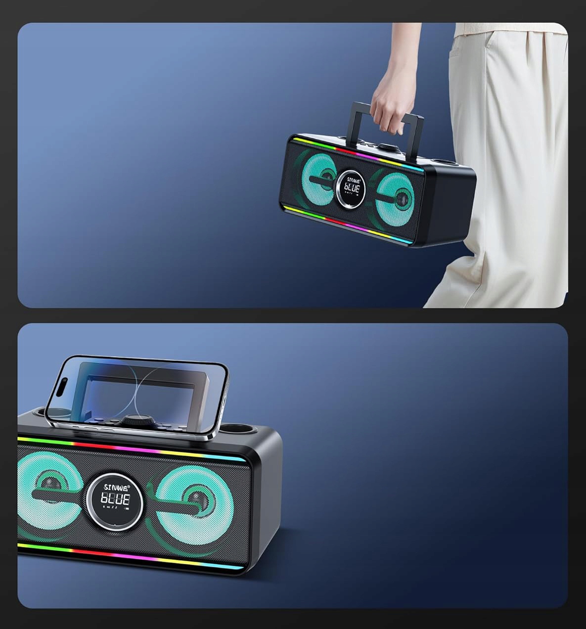 ✨ Портативная караоке -машина оснащена полноцветными динамиками премиум -класса 2 с мощностью 15 Вт b>, четкими высокими тонами, точными средними тонами и глубокими басами, которые обеспечивают богатые, живые и реалистичные звуки. обеспечение шокирующих аудиовизуальных эффектов.