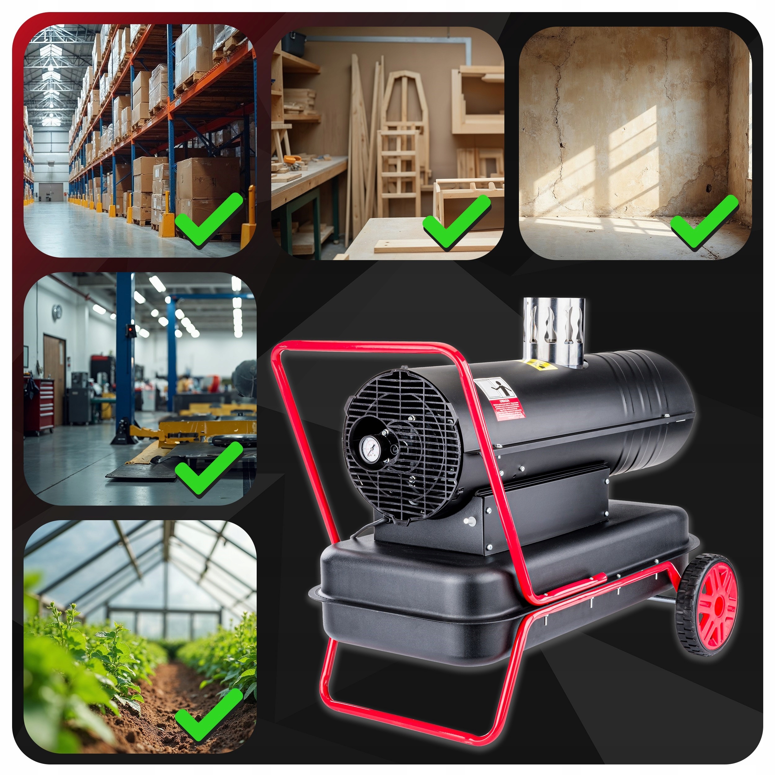 Нагреватель идеально подходит для обогрева объектов, производственных цехов значительной высоты, хозяйственных построек, путей сообщения, складов, мастерских, церквей, теплиц, туннелей и для животноводства где обеспечена надлежащая вентиляция. Благодаря своей мобильности и эффективности он идеально подходит для больших, плохо изолированных помещений, где необходимо быстрое и эффективное повышение температуры.