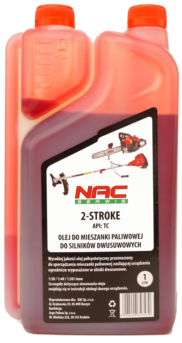 Оригинальное масло NAC высочайшего качества, предназначенное для смазки двухтактных двигателей пил, газонокосилок и другой садовой техники, особенно пневматической. -охлажденные.