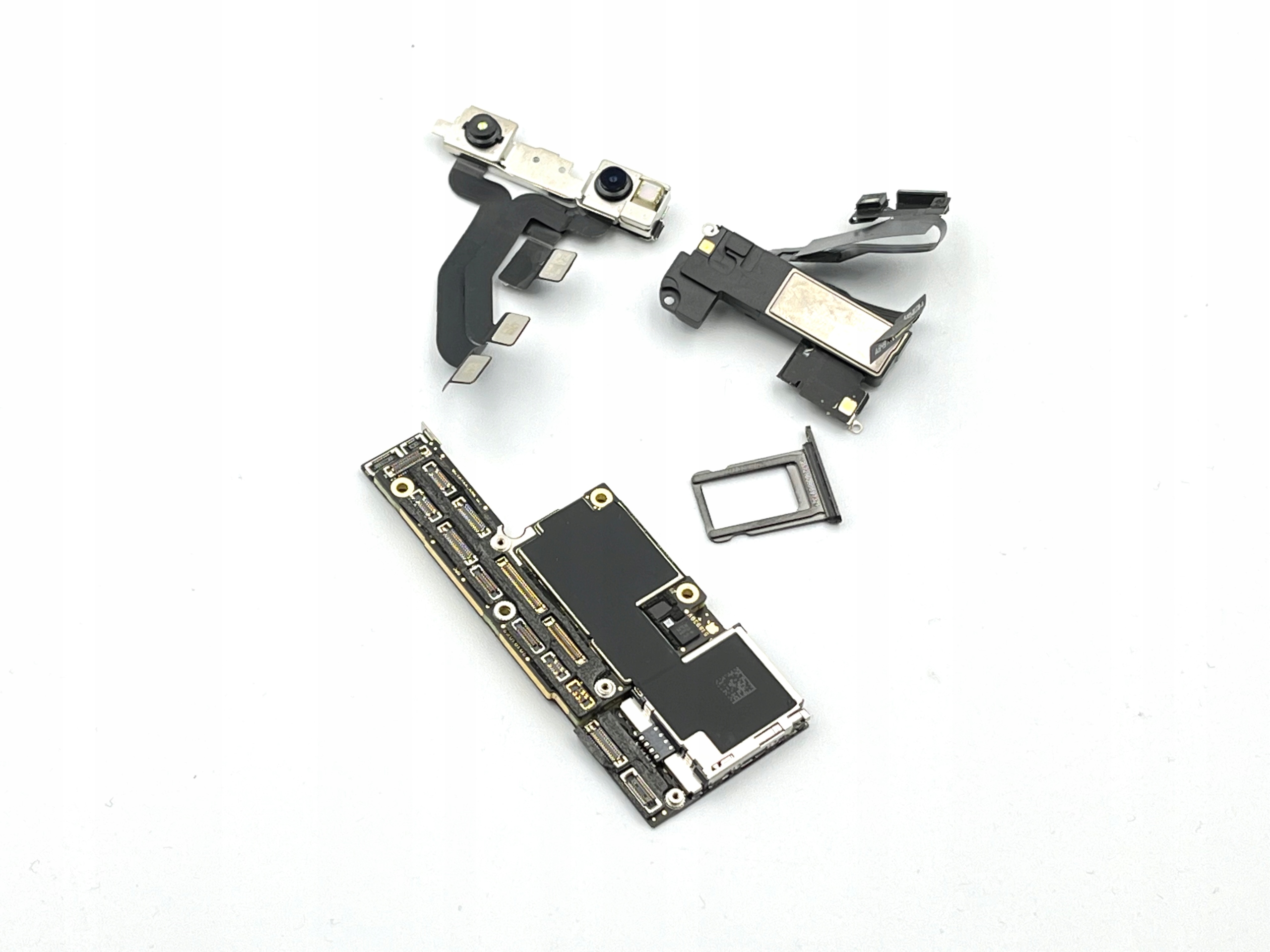 На материнской плате имеется лента для верхнего динамика и фронтальной камеры, благодаря которой работает функция Face ID. Аккумулятор БЕСПЛАТНО (состояние 80%), можно с помощью электроники заменить его на новый.