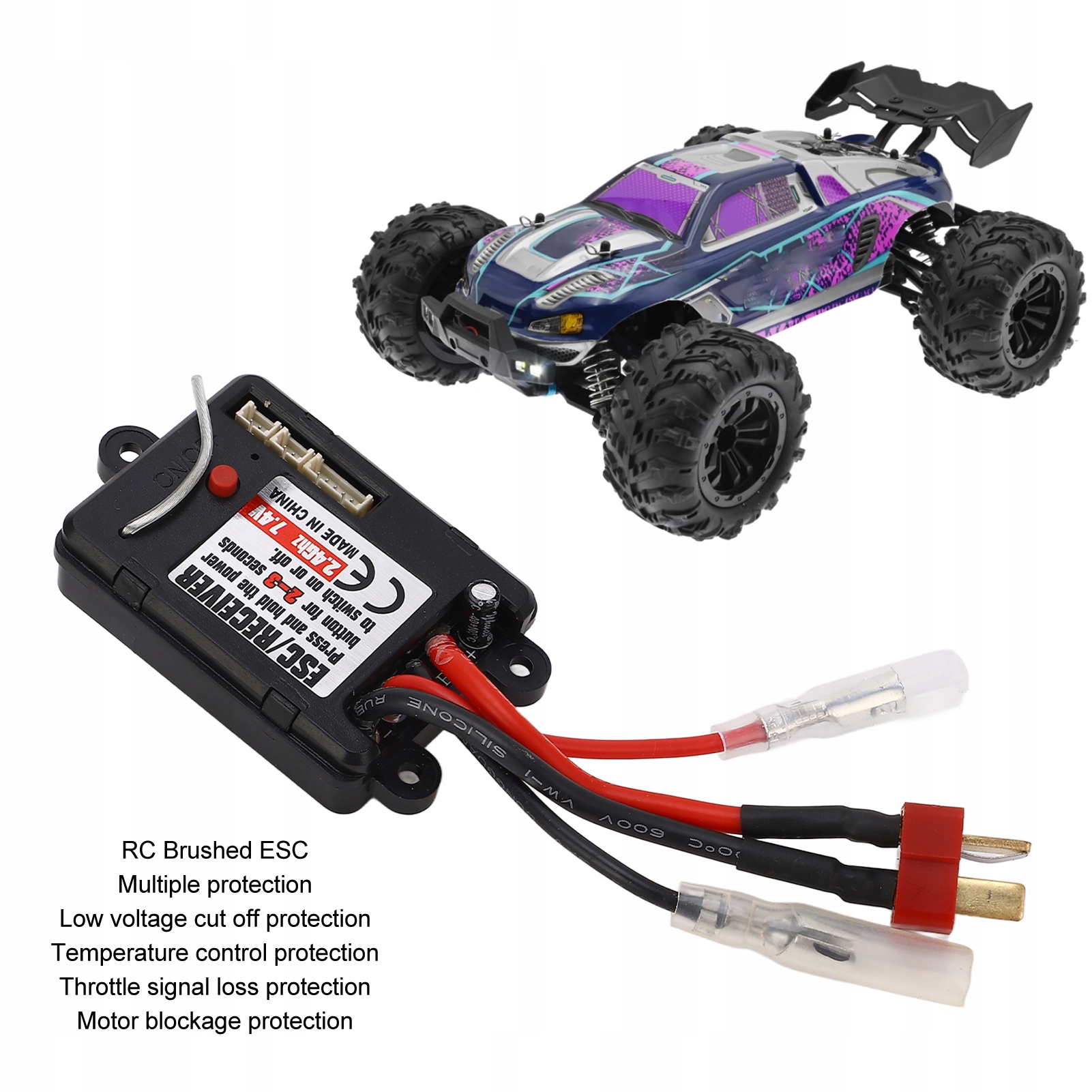 2. Многократная защита: щетка ESC имеет защиту от низкого напряжения, защита от контроля температуры, защита от потери сигнала дроссельной заслонки и защиты блокировки двигателя.