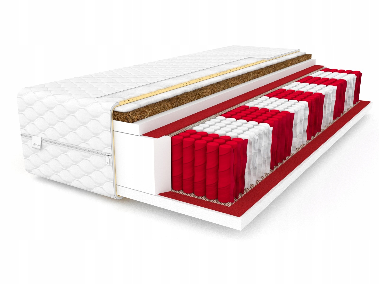Матрас с карманной вставкой с множеством карманов, окруженный с обеих сторон высокоэластичным пенополиуретаном и с одной стороны кокосовым ковриком. Изготовлено с использованием новейших технологий, из проверенных компонентов высочайшего качества.