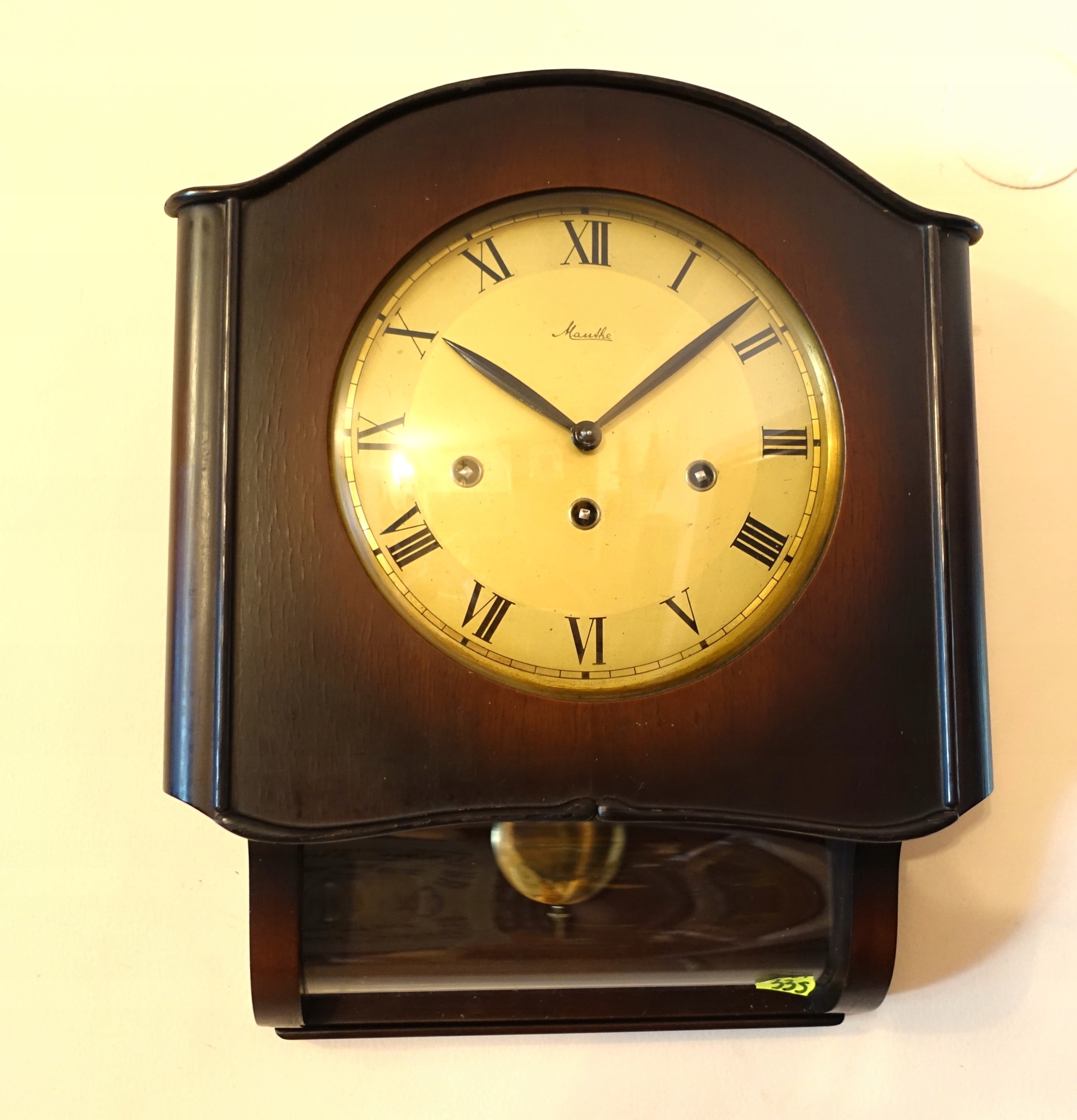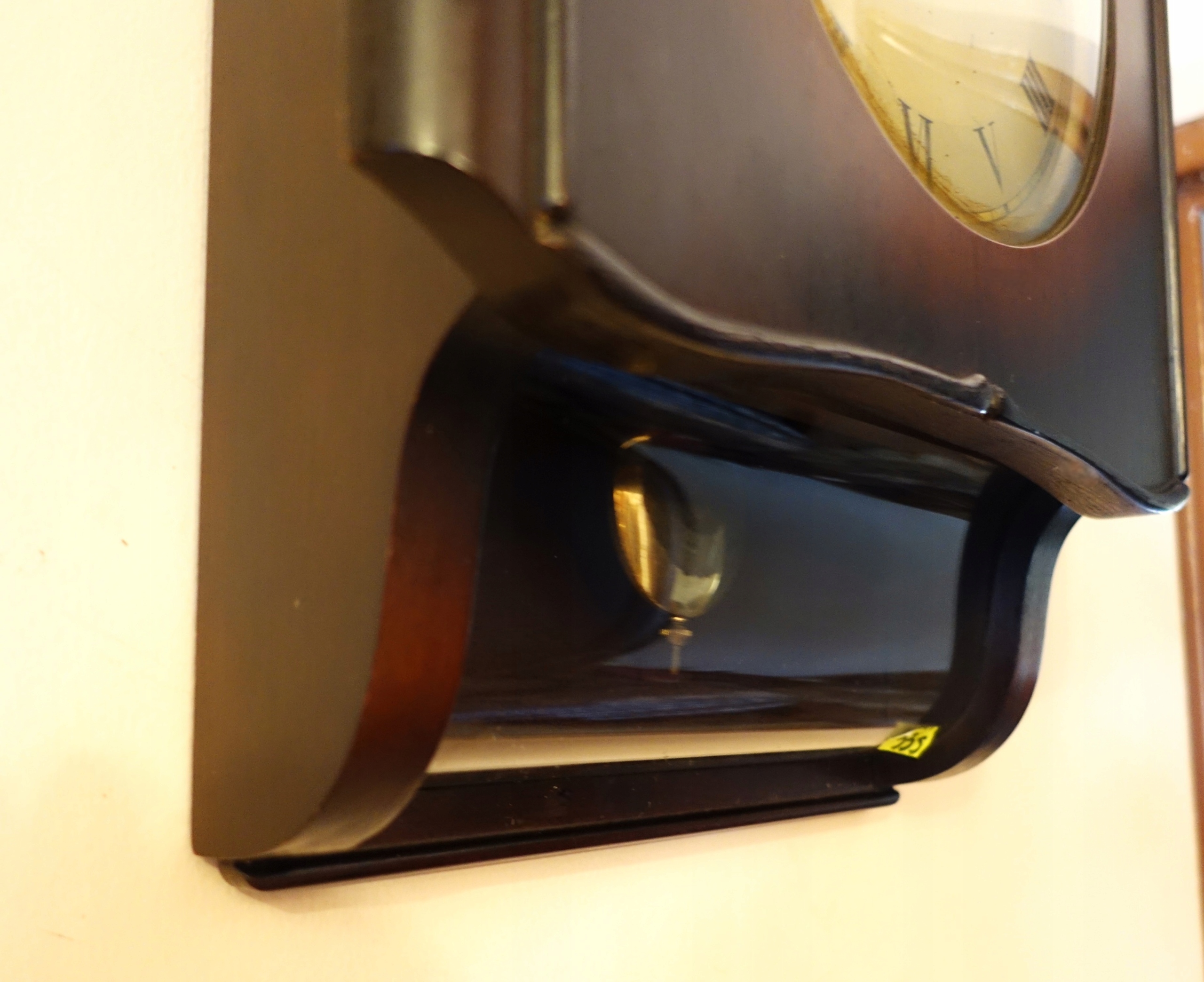 В интересной форме, деревянный в темно -коричневом цвете. Нижняя часть коробки обучена, что позволяет наблюдать за работой маятника. Сундук сохранился в хорошем состоянии, без следов коры жуков.