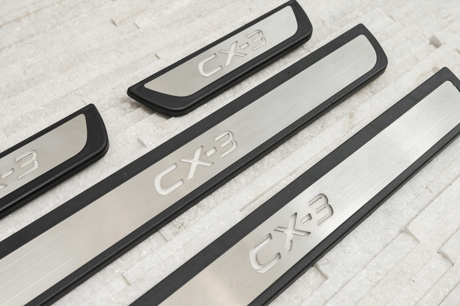 Полоски крепятся на окрашенные части внутренних порогов. Они дополняют внутреннюю линию двери и придают зоне подоконника спортивный и элегантный вид. Данная модель привлекает внимание декоративной подсвеченной надписью CX-3. Благодаря встроенной светодиодной подсветке элемент не только подчеркивает современный стиль автомобиля, но и освещает зону порогов, облегчая посадку и выход из автомобиля.