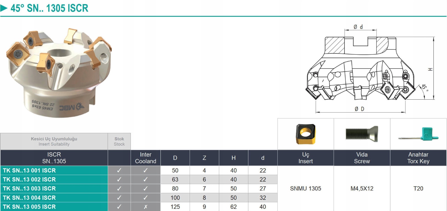 Mill -Feted Miling Head 45 ° Fi 80 на плитках SNMA 1305 и один 05 .. с внутренним охлаждением MBC