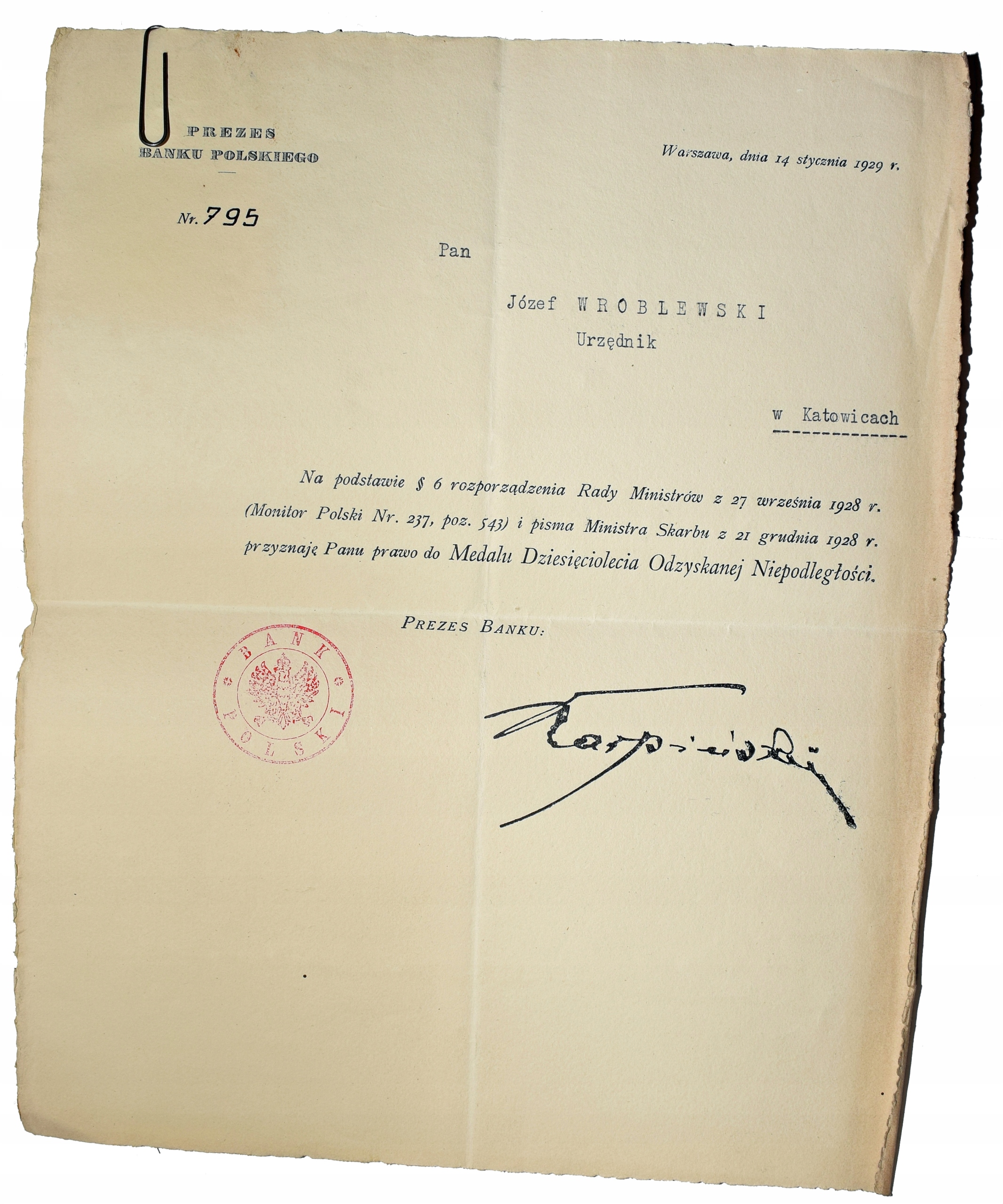 Документ подписан президентом Bank Polski - Станиславом Карпинским. Бумага ручной работы.