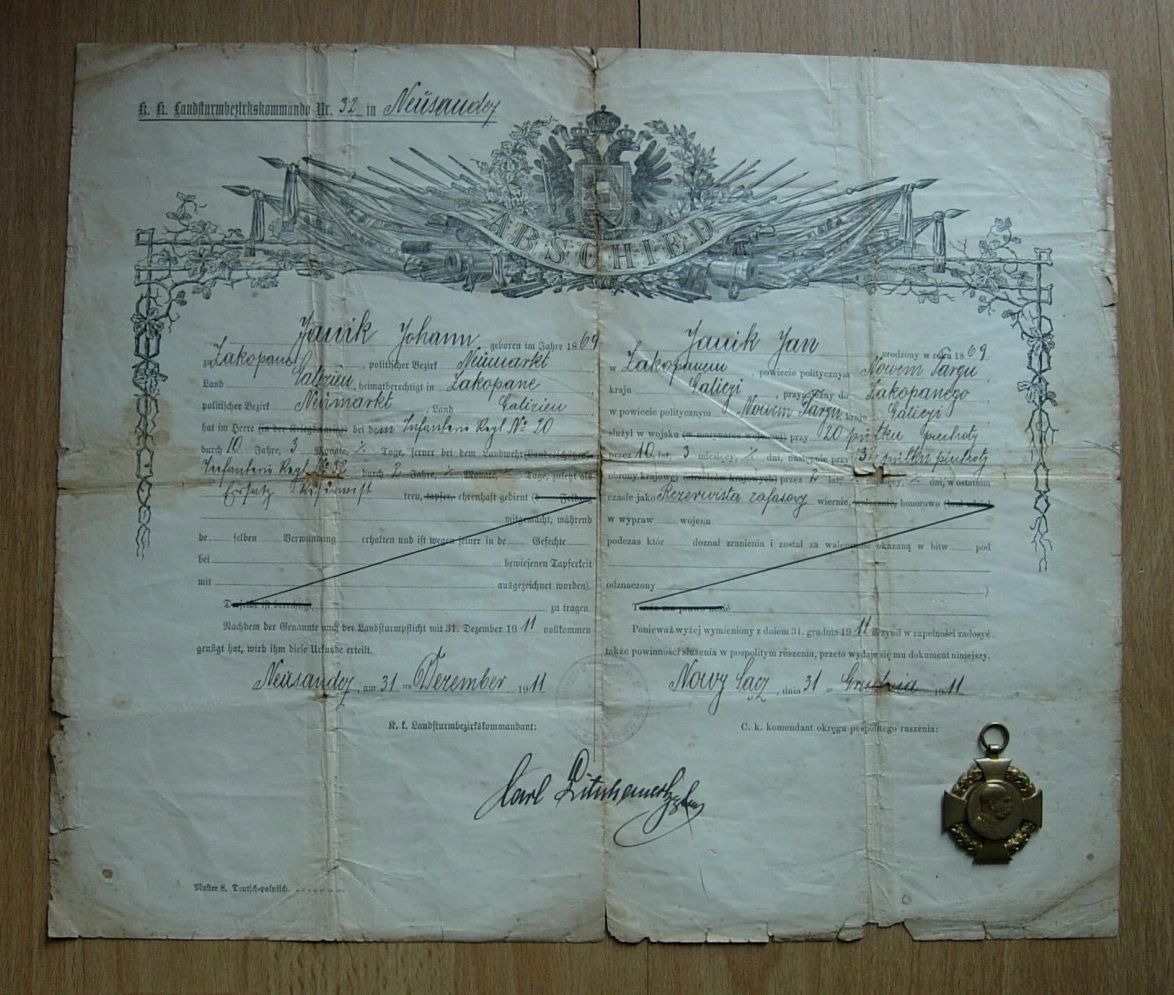МЕДАЛЬ АВСТРО-УГОРЩИНА + ПОСВІДЧЕННЯ ЗАСВІДЧЕННЯ ПОЛЯК, 10 полк СК