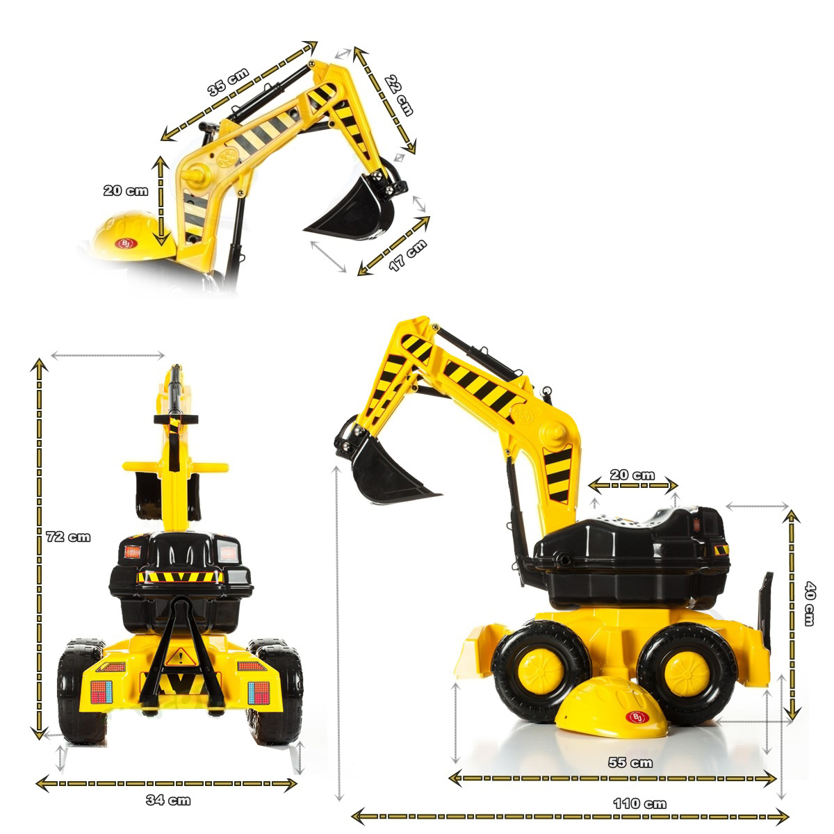 РЕБЕНОК МОЖЕТ УПРАВЛЯТЬ ПОДВИЖНЫМ КОВШОМ ЭКСКАВАТОРА, ВРАЩАТЬСЯ НА ВРАЩАЮЩЕСЯ СИДЕНЬЕ НА 360 ГРАДУСОВ, А ТАКЖЕ ПЕРЕДВИЖАТЬ ВЕСЬ КОМПЛЕКТ ВПЕРЕД И НАЗАД, ПОДТЯГИВАЯСЬ НОГАМИ ВВЕРХ!