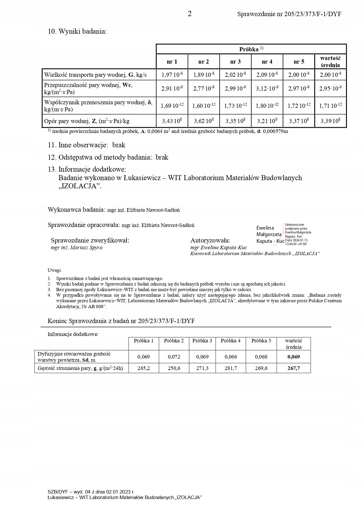 Ниже представлен отчет по испытанию паропроницаемости мембраны, из которой мы производим мембранные гаражные покрытия. Испытания проводились в независимой аккредитованной исследовательской лаборатории. Испытание подтверждает высокую паропроницаемость мембраны с очень хорошим результатом 0,69 Sd и проникновение водяного пара через покровную мембрану на уровне 267,7 грамм водяного пара на м2 мембраны за 24 часа согласно PN-EN. ISO 12572:2016-10.