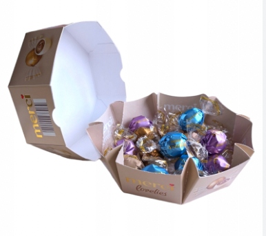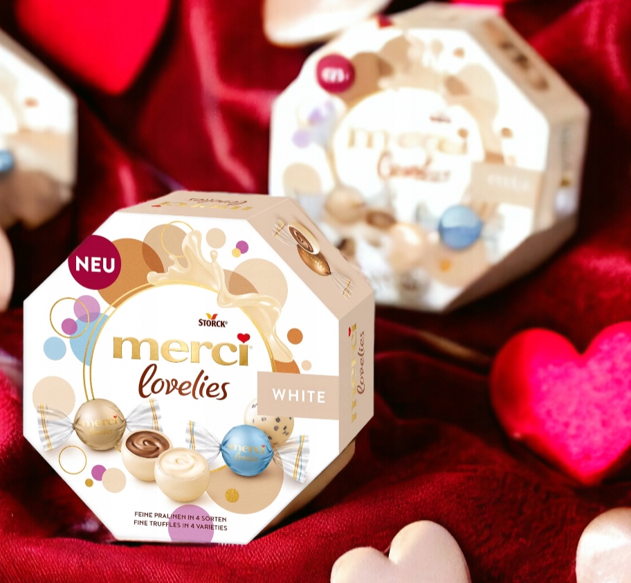 С вкусным Merci Lovels White Вы можете сделать своих близких счастливыми. С покрытием белого шоколада у них приятный мягкий вкус. Хрустящие шарики нежно таят на языке и развивают вкусную начинку. Полный вкус для требования сладостей. Подарочная коробка имеет размеры около 15 x 15 x 5 см и содержит следующие разновидности:
