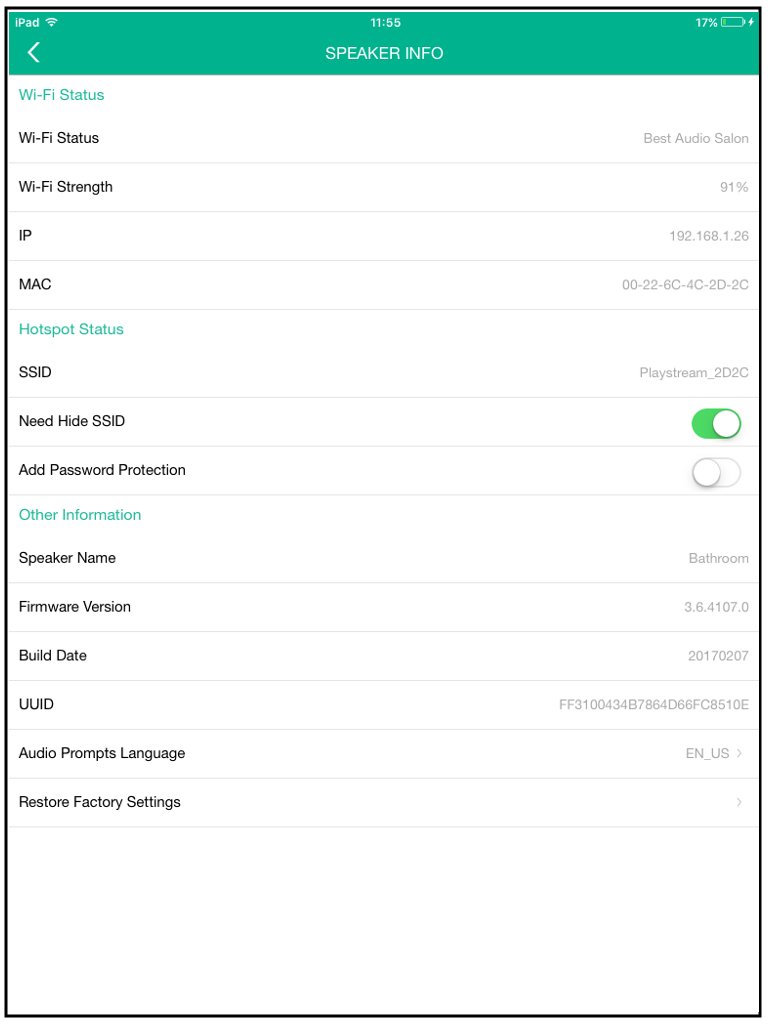 ИНФОРМАЦИЯ О СПИКЕРЕ – получение информации о настройках Wi-Fi, точке доступа, текущей версии и т. д.