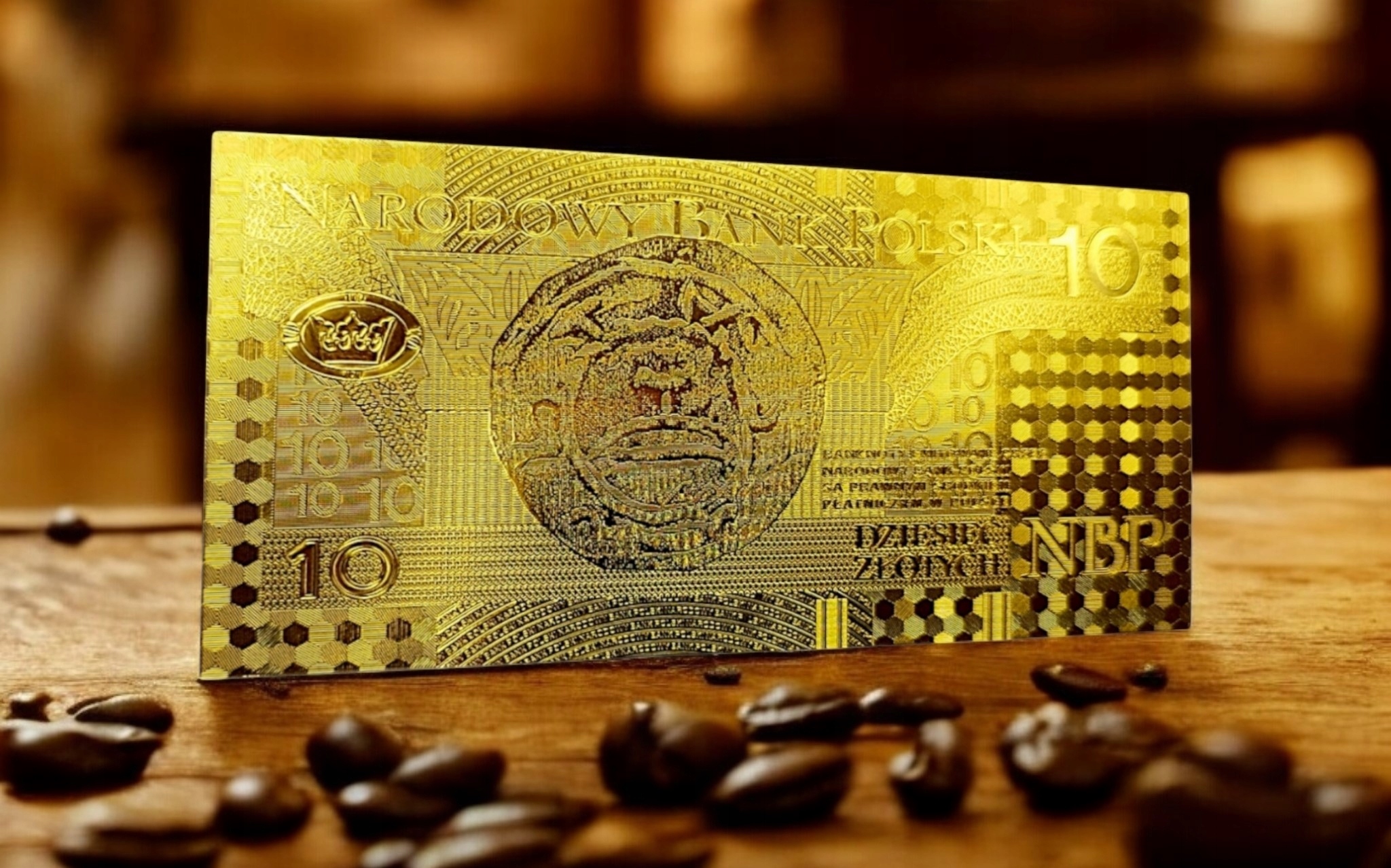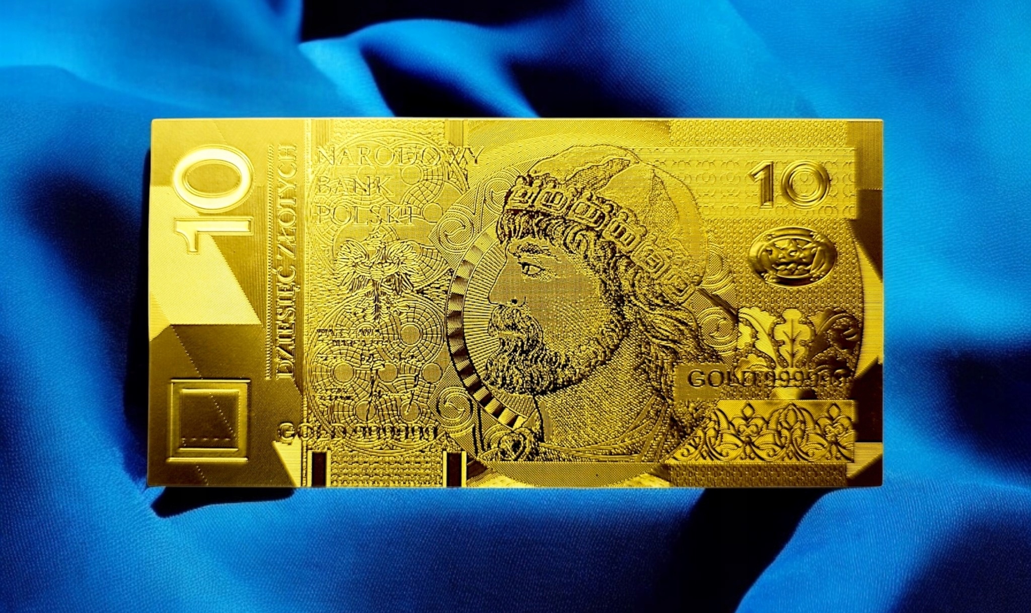Красивая копия банкноты польского обращения, изготовленная из ПВХ и покрытая золотой фольгой.