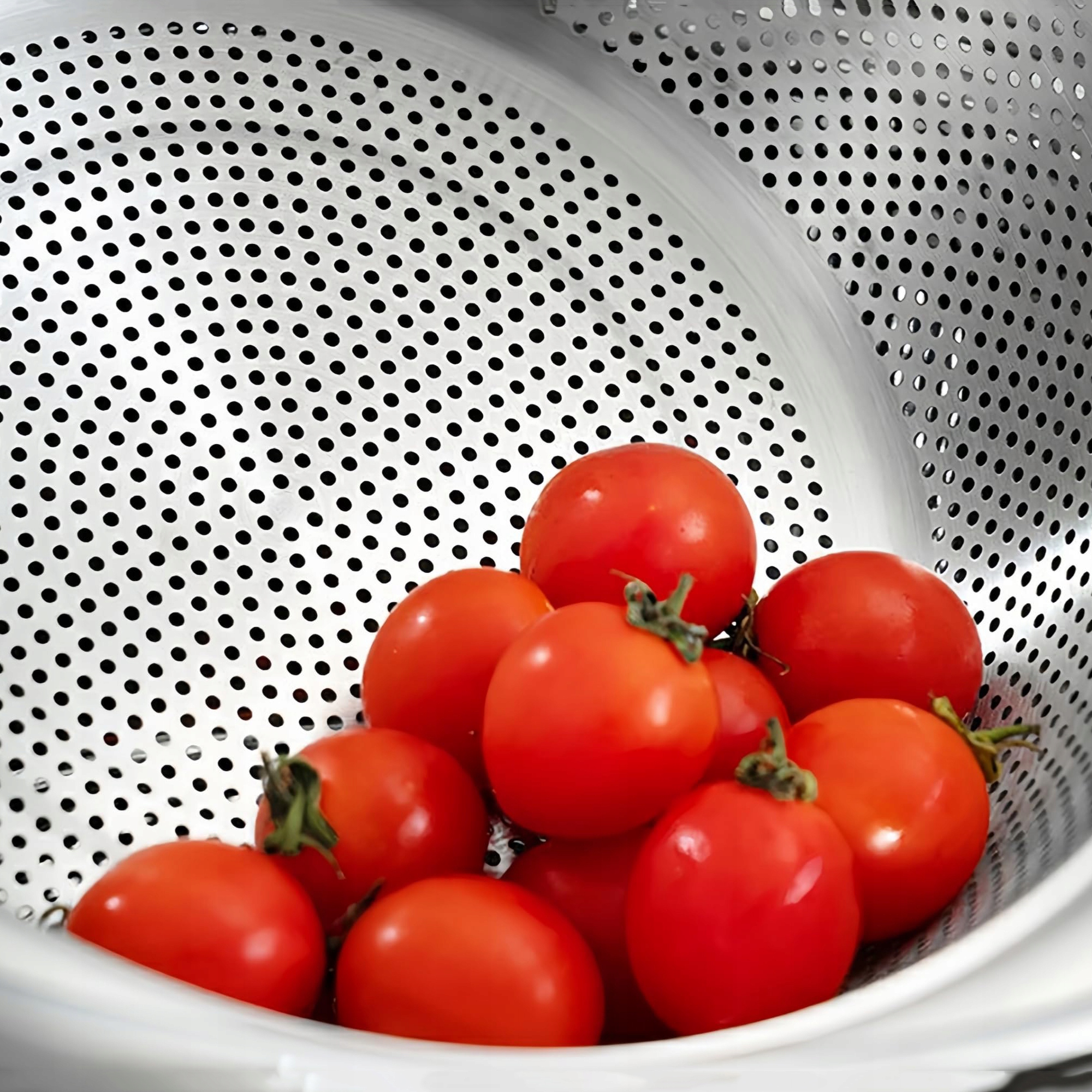 Дренажное отверстие имеет диаметр около 2 мм, что означает, что пища быстро осушается. Сетка долговечна и не деформируется, не растягивается и не охватывает, даже под весом пищи (особенно рис и спагетти не пропадают через отверстия). Ремень идеально подходит для полоскания риса, хлопьев, бобов и чечевицы.