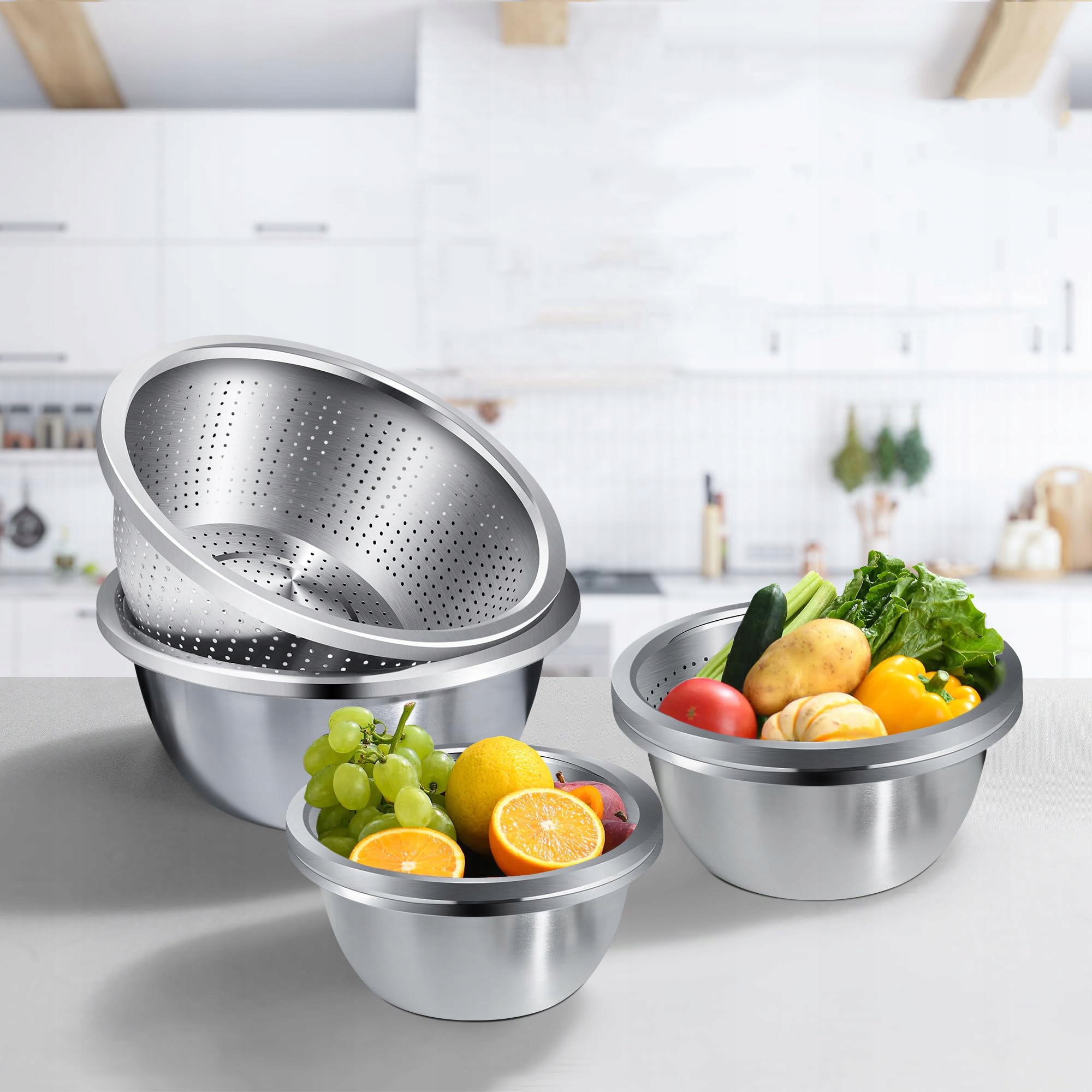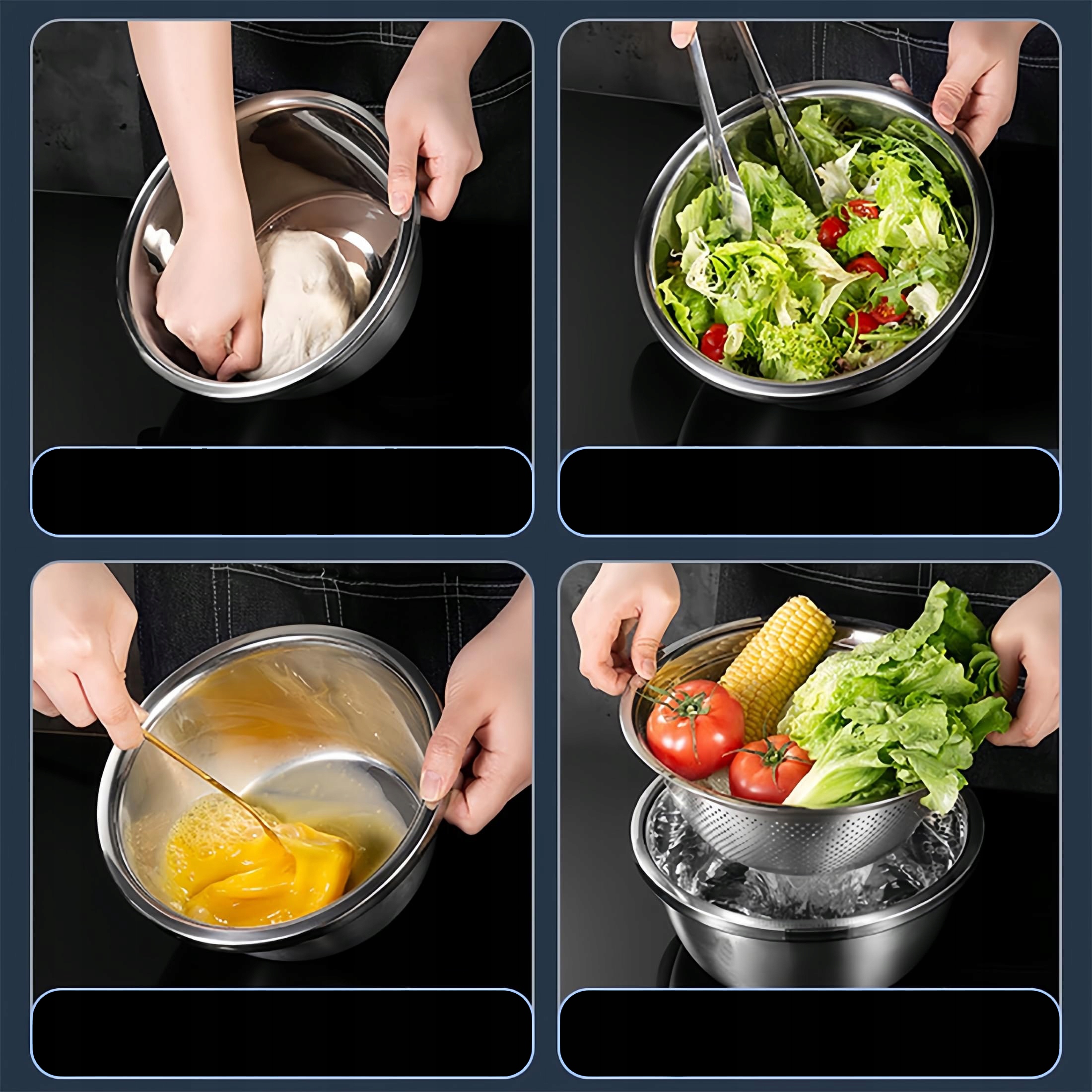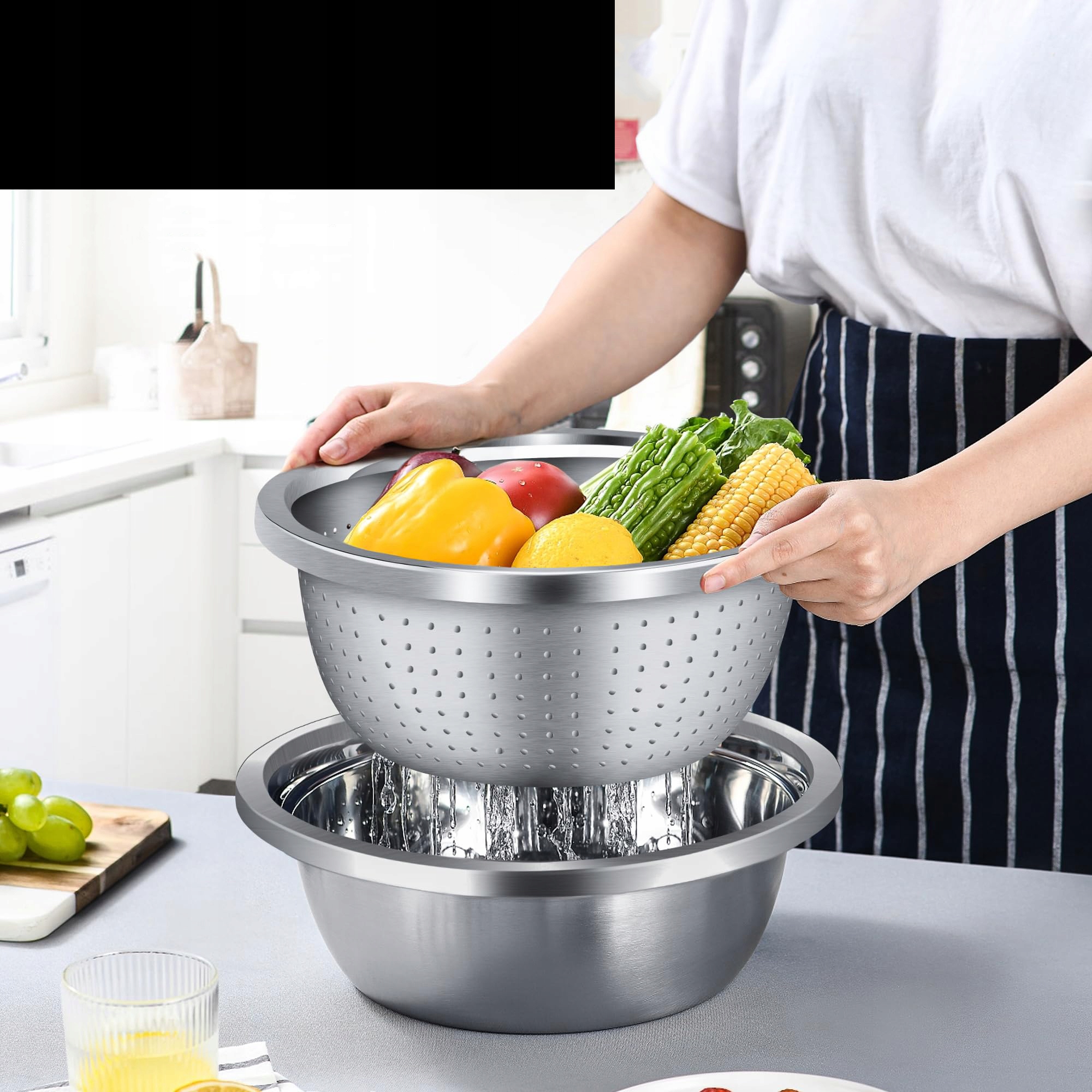 Грязное место помещается в соответствующую миску и собирает остатки воды. Миску для смешивания салатов можно использовать отдельно для смешивания овощных салатов, вымывания фруктов, впитывания бобов, чечевицы и других зерновых. Сделанная из пищи, безопасная для еды, эта многофункциональная миска также совместима с индукционными тарелками.