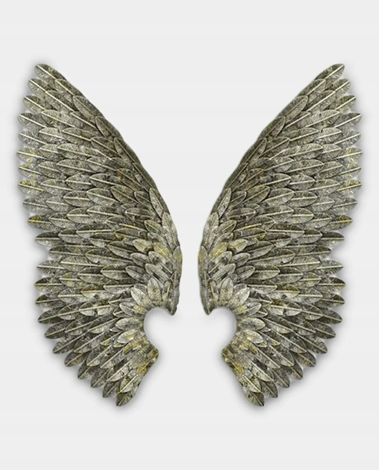 Красивая, большая настенная панель в форме замысловато, образовавшихся два крыла после присоединения к сердцу. Романтическое украшение идеально подходит для декора свадебного зала, для свадьбы или фотосессии Валентина. Это также великолепно в качестве юбилейного подарка с гравированным посвящением, украшением спальни или салоном красоты. Крылья были созданы путем объединения огромного количества маленьких трехмерных перьев и слегка почистились золотой краской. Сложный набор содержит 2 металлических крылья.