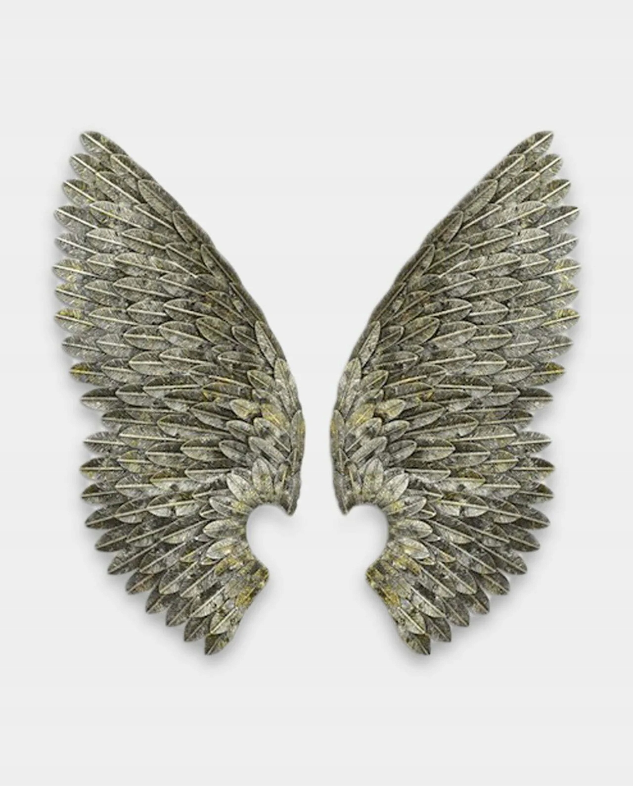 Красивое большое настенное панно в виде двух крыльев замысловатой работы, которые при соединении образуют сердце. Романтическое украшение, идеально подходящее для свадебного зала, свадебной фотосессии или фотосессии ко Дню святого Валентина. Он также отлично подойдет в качестве подарка на годовщину с выгравированным посвящением или в качестве украшения спальни или салона красоты. Крылья были созданы путем объединения огромного количества маленьких трехмерных перьев и деликатной покраски золотой краской. В набор искусной работы входят 2 металлических крыла.