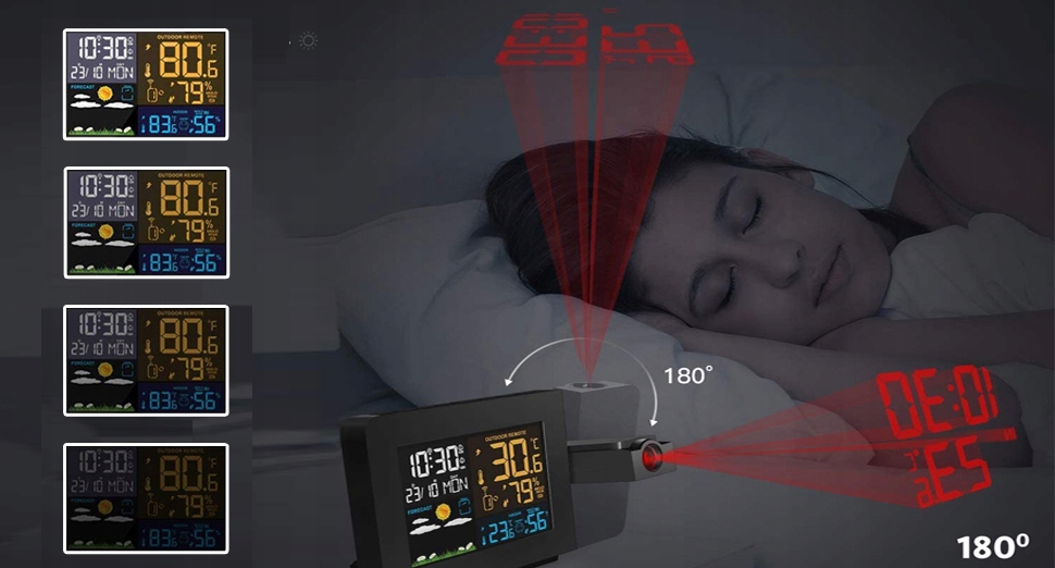 Идеальные будильники спальни (не атомные). Температура прогноза меняется автоматически от внутренней до внешней температуры. Будильник, отображаемый в тонком красном цвете на потолке или стене, легко увидеть во всей комнате. Регулируемые углы проекции и яркость - его можно изменить на 180 градусов, чтобы получить оптимальное представление и соответствовать различным пользовательским предпочтениям.