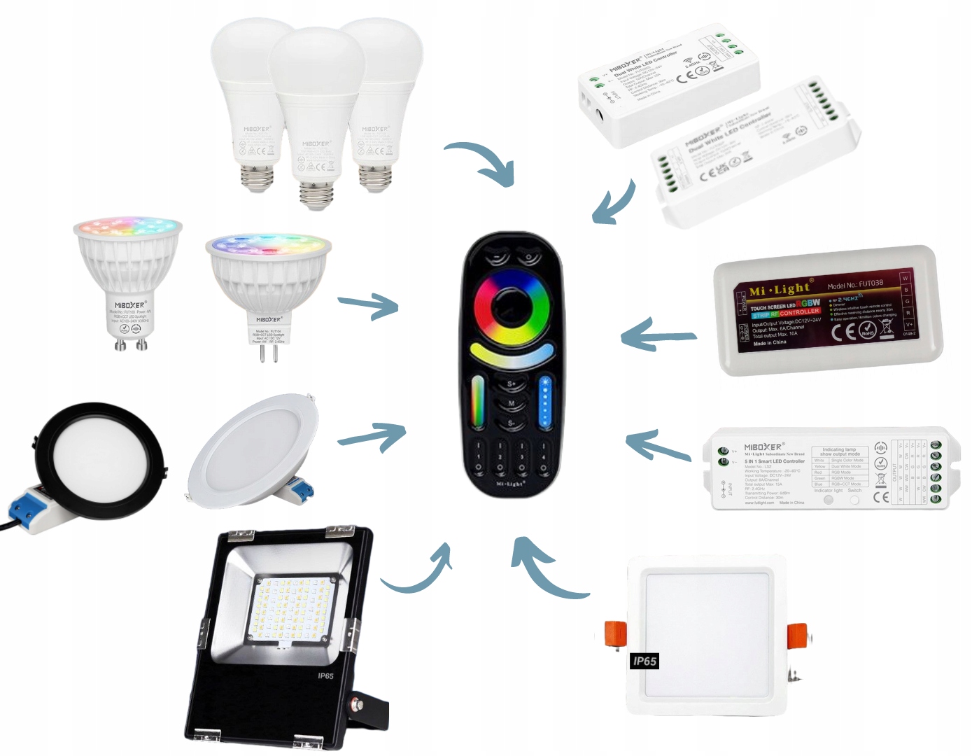 Контроллер Mi-Light позволяет просто создавать зоны освещения. Контроллер работает в 4- и 8-зонном стандарте, а также отдельные контроллеры можно группировать вместе. В одной зоне может быть любое количество контроллеров (или лампочек, совместимых с системой Mi-Light). В нашем предложении также есть более дешевые комплекты Mi-Light – без зональных функций. В системе Ми-лайт мы не используем усилители сигнала. Просто используйте больше контроллеров и назначьте их одной зоне.