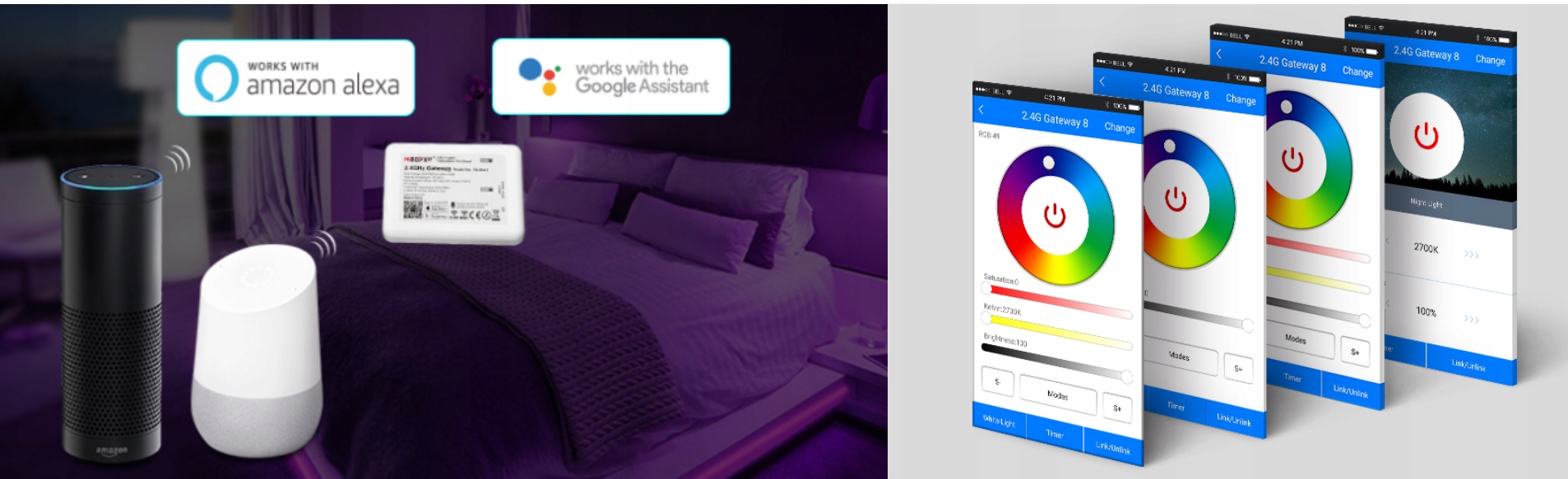 Система позволяет управлять светодиодным освещением по беспроводной сети с помощью мобильного приложения для Android, iOS и с помощью сенсорного пульта или панели. Для управления с помощью телефона/планшета требуется использование специального Wi-Fi-концентратора Mi-Light, который подключается к контроллерам, обеспечивающим мобильное управление освещением.