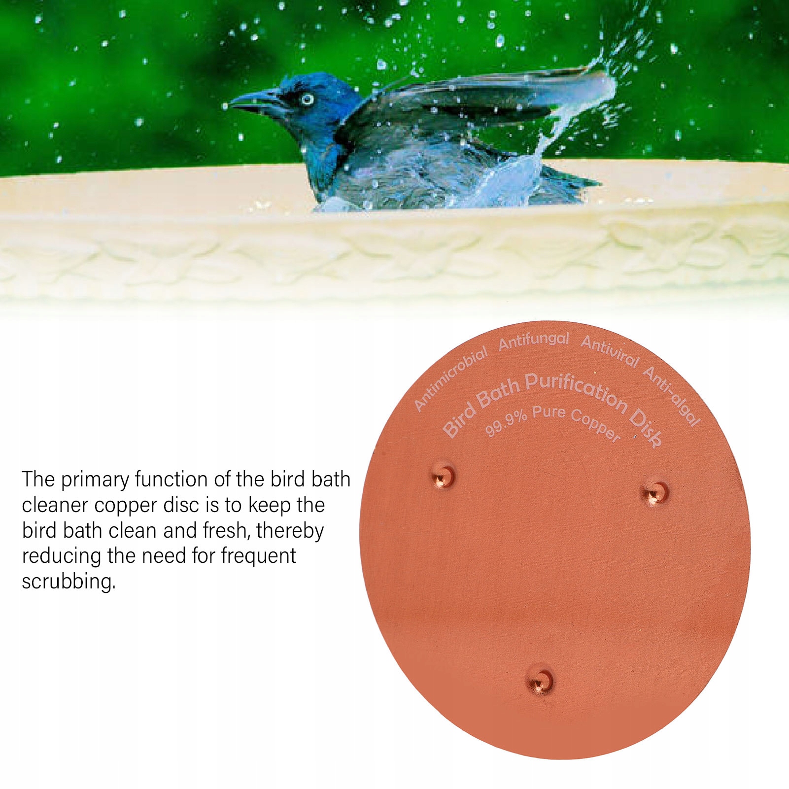 2. Медь с высокой чистотой: диск для ванной птицы изготовлен из 99,99 чистой меди, толщиной 1 мм до внешнего использования снаружи. Это создает защитный слой природы, чтобы поддерживать чистую воду.